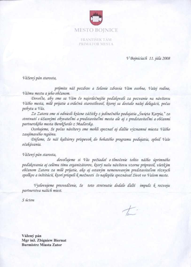 Dziękuje włodarzom miasta i urzędnikom miejskiego ratusza za zorganizowanie i przygotowanie spotkania miast partnerskich oraz zorganizowanie pobytu w Zatorze.