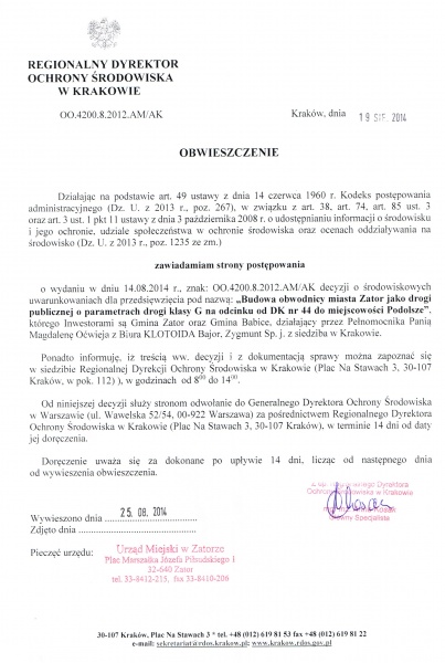 Obwieszczenie Regionalnego Dyrektora Ochrony Środowiska w Krakowie o wydaniu decyzji dla przedsięwzięcia pn.: "Budowa obwodnicy miasta Zator jako drogi publicznej o parametrach drogi klasy G na odcinku od DK nr 44 do miejscowości Podolsze"