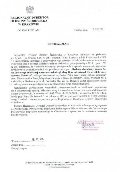 Obieszczenie w sprawie przedsięwzięcia pn. "Budowa obwodnicy miasta Zator jako drogi publicznej o parametrach drogi klasy G na odcinku od DK nr 44 do miejscowości Podolsze".