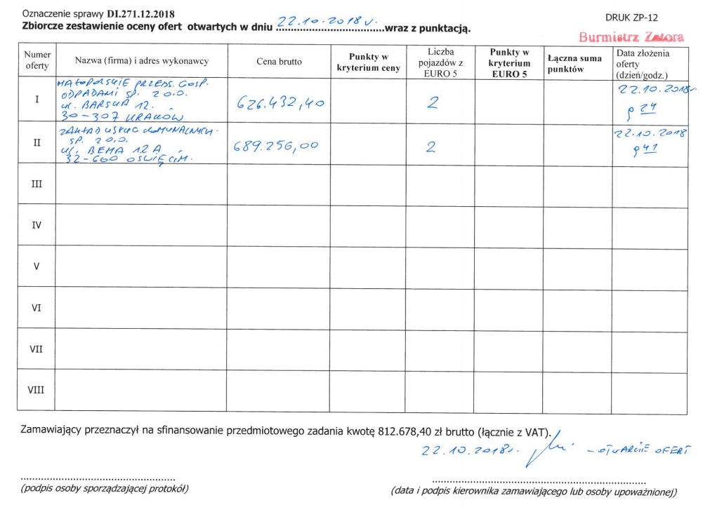 Zamawiający zamieszcza w załączeniu „zbiorcze zestawienie otwartych ofert…” w przetargu nieograniczonym na Odbieranie i transport do zagospodarowania odpadów komunalnych od właścicieli nieruchomości położonych na terenie Gminy Zator w okresie od 1 stycznia 2019 roku do 31 grudnia 2019 roku, wraz z informacjami, zgodnie z art. 86 ust. 5 ustawy Prawo zamówień publicznych.