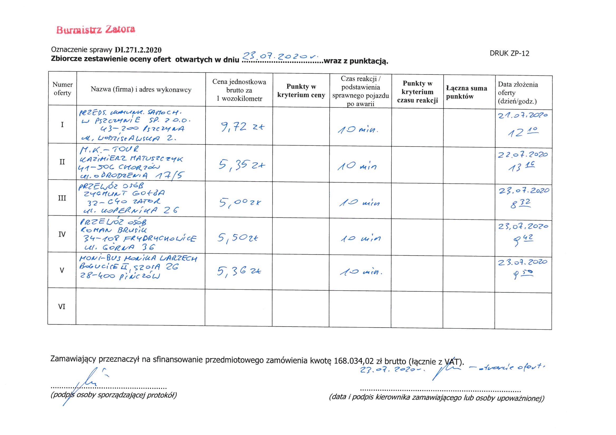 Zamawiający zamieszcza w załączeniu „zbiorcze zestawienie otwartych ofert…” w przetargu nieograniczonym na Dowóz dzieci i młodzieży do szkół oraz ze szkół do miejsc zamieszkania, na terenie gminy Zator, w roku szkolnym 2020-2021, zgodnie ze „Specyfikacją tras...” - zał. nr 1 do umowy, „Regulaminem przewozu dzieci...”- zał. nr 2 do umowy, oraz „Oświadczeniem opiekuna” – zał. nr 3 do umowy, wraz z informacjami, zgodnie z art. 86 ust. 5 ustawy Prawo zamówień publicznych.