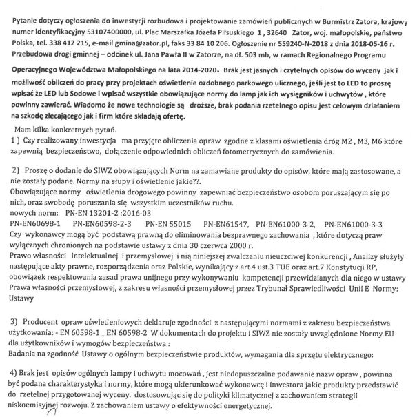 Pytania Wykonawcy i odpowiedzi Zamawiającego oraz inne dodatkowe informacje dotyczące przetargu nr DI.271.4.2018 na: Przebudowę drogi gminnej – odcinek ul. Jana Pawła II w Zatorze, na dł. 503 mb, w ramach Regionalnego Programu Operacyjnego Województwa Małopolskiego na lata 2014-2020.