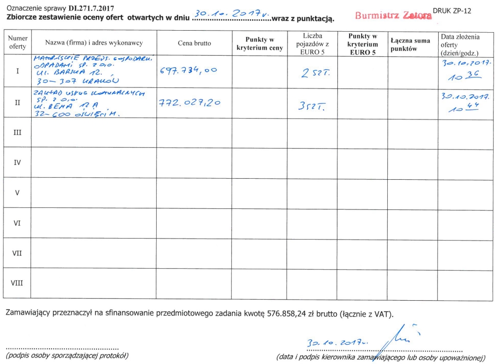 Zamawiający zamieszcza w załączeniu „zbiorcze zestawienie otwartych ofert…” dotyczące Odbierania i transportu do zagospodarowania odpadów komunalnych od właścicieli nieruchomości położonych na terenie Gminy Zator w okresie od 1 stycznia 2018 roku do 31 grudnia 2018 roku, wraz z informacjami, zgodnie z art. 86 ust. 5 ustawy Prawo zamówień publicznych.