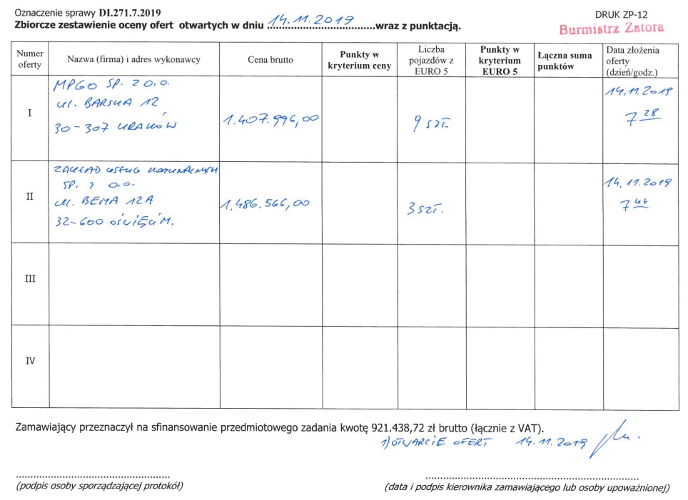 Zamawiający zamieszcza w załączeniu „zbiorcze zestawienie otwartych ofert…” w przetargu nieograniczonym na Odbieranie i transport do zagospodarowania odpadów komunalnych od właścicieli nieruchomości położonych na terenie Gminy Zator w okresie od 1 stycznia 2020 roku do 31 grudnia 2020 roku, wraz z informacjami, zgodnie z art. 86 ust. 5 ustawy Prawo zamówień publicznych.
