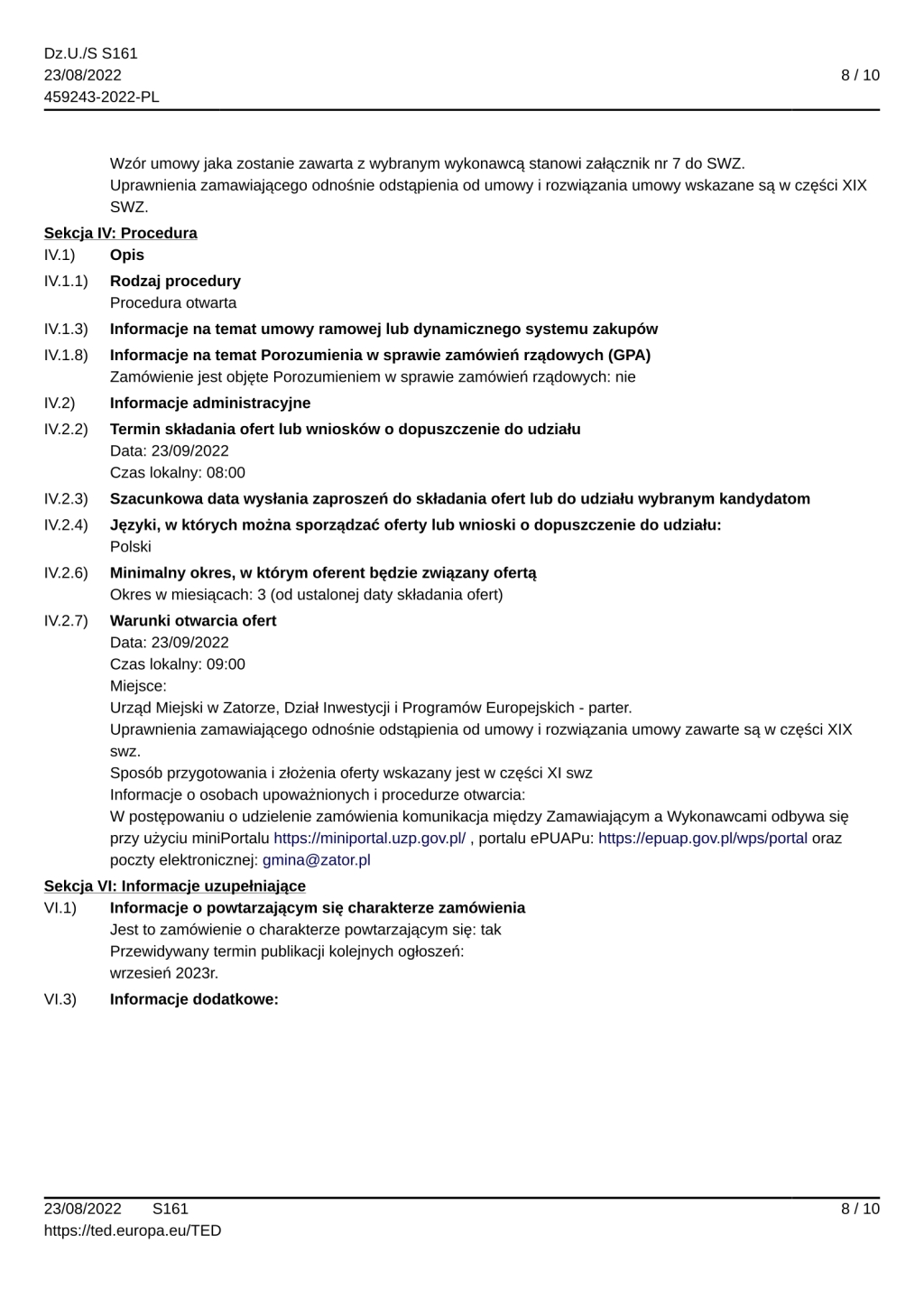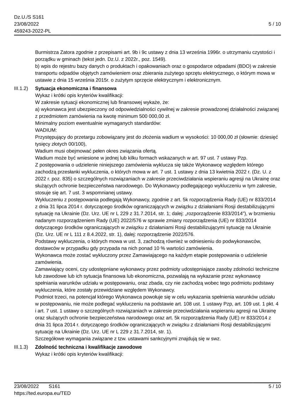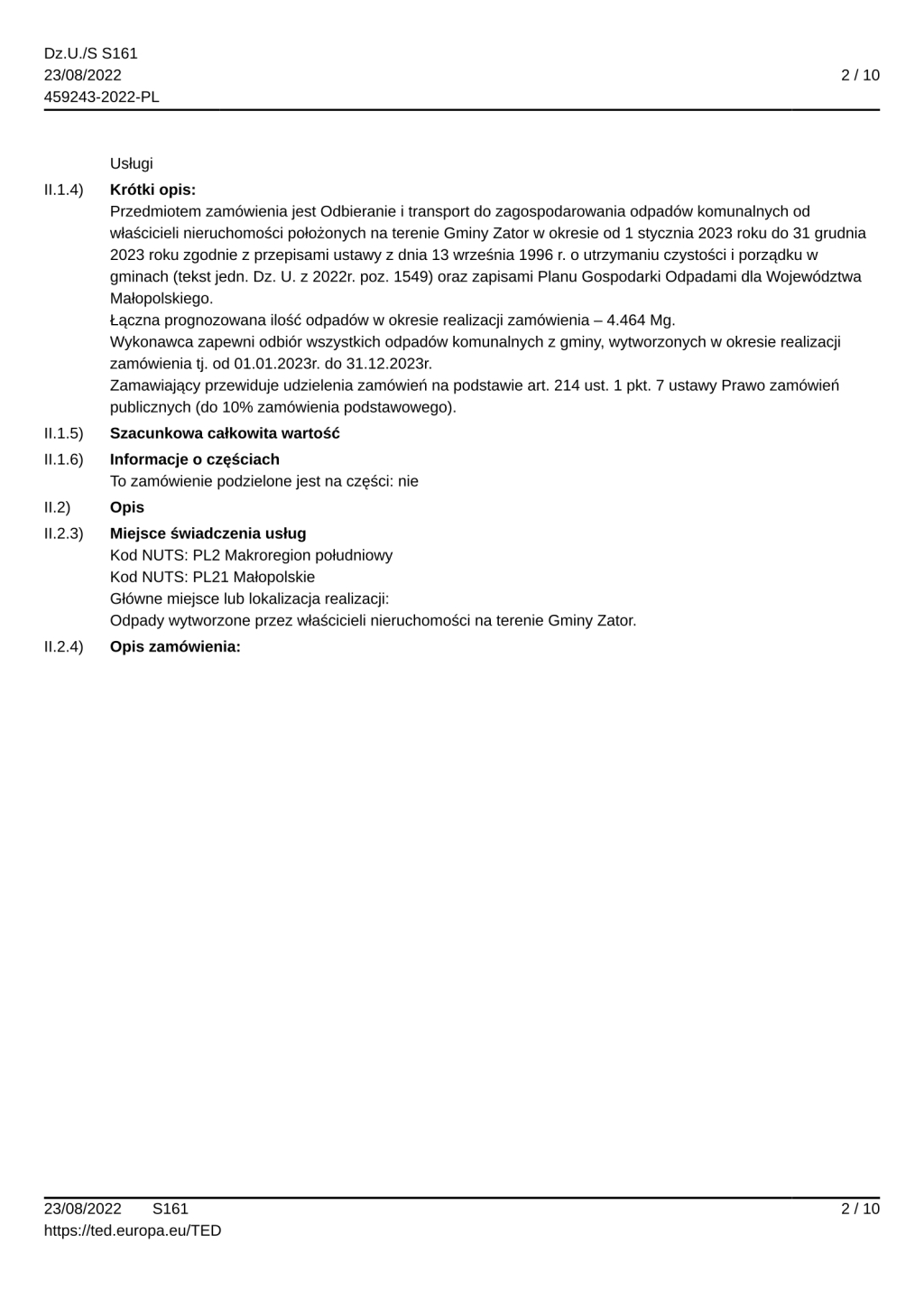 DI.271.8.2022 Odbieranie i transport do zagospodarowania odpadów komunalnych od właścicieli nieruchomości położonych na terenie Gminy Zator w okresie od 1 stycznia 2023 roku do 31 grudnia 2023 roku.