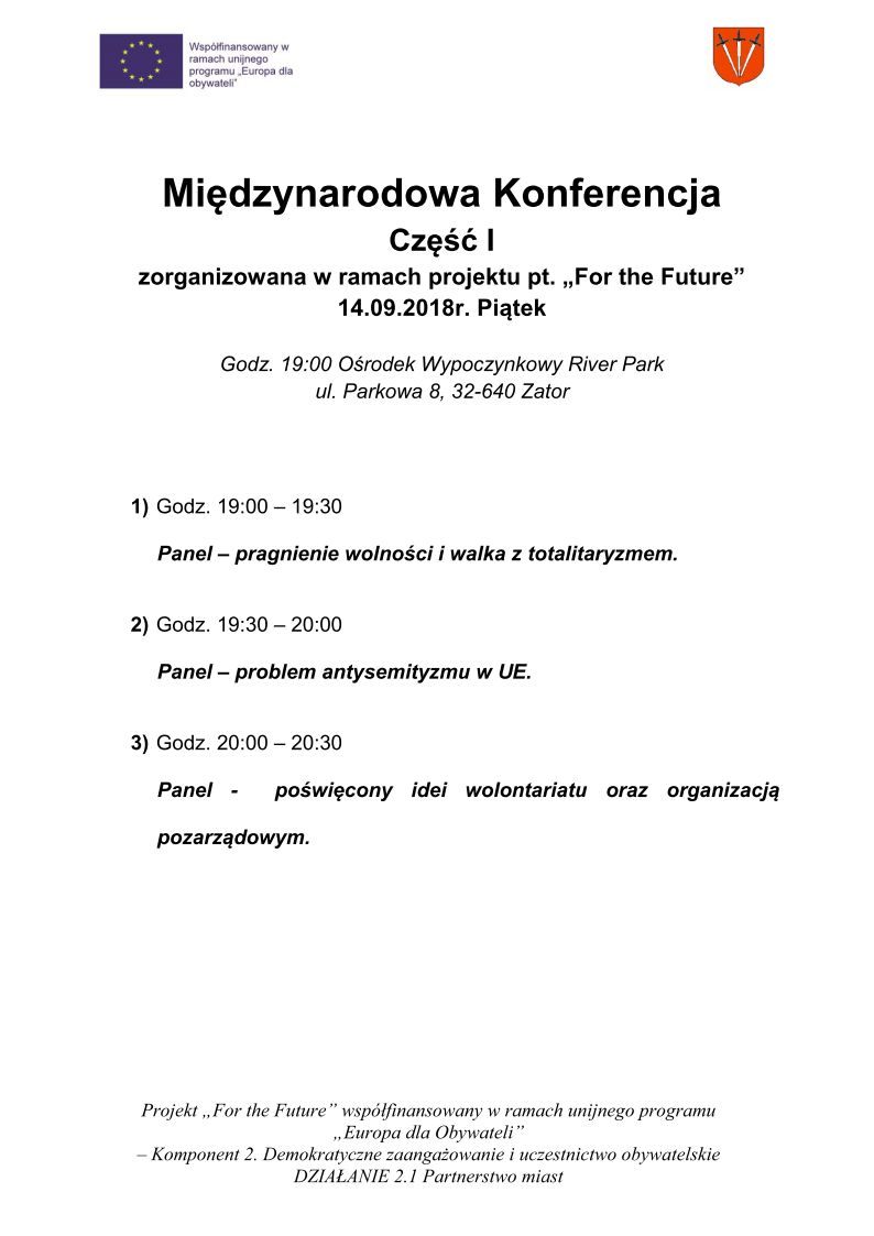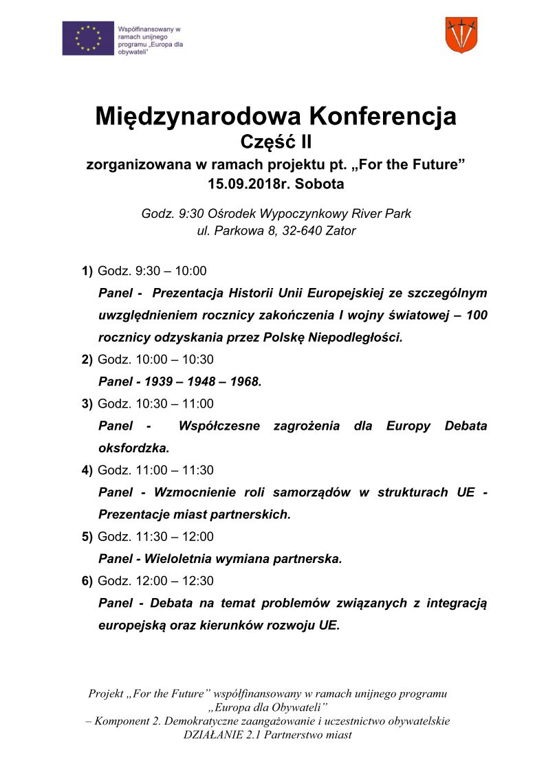 Delegacje z Bojnic, Terchovej i Berekfurdo przyjechały do Zatora 13.09.2018 tj. w czwartek po południu. Czas poświęcono głownie na zakwaterowanie odprawę oraz przekazanie praktycznych informacji dotyczących realizacji projektu i pobytu w Zatorze. W piątek 14.09.2018 do południa przedstawiciele poszczególnych delegacji z miast partnerskich odwiedzili Muzeum Aushwitz w Oświęcimiu i Brzezince, gdzie złożono kwiaty pod ścianą śmierci. Wieczorem zorganizowano międzynarodową konferencję podczas której zaprezentowano tematy: