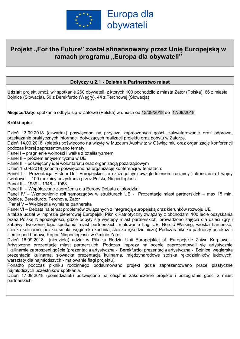 W dniach od 13.09.2018 do 17.09.2018r. w ramach realizowanego przez Gminę Zator projektu pt. For the Future“ współfinansowanego w ramach unijnego programu „Europa dla Obywateli” – Komponent 2. Demokratyczne zaangażowanie i uczestnictwo obywatelskie DZIAŁANIE 2.1 Partnerstwo miast do Zatora przyjechali przedstawiciele zaprzyjaźnionych miast partnerskich tj. węgierskiego Berekfurdo oraz Terchovej i Bojnic na Słowacji. Przyjmowaliśmy łącznie 160 uczestników w tym 66 osób z Bojnic, 50 z Berekfurdo i 44 osoby z Terchovej.