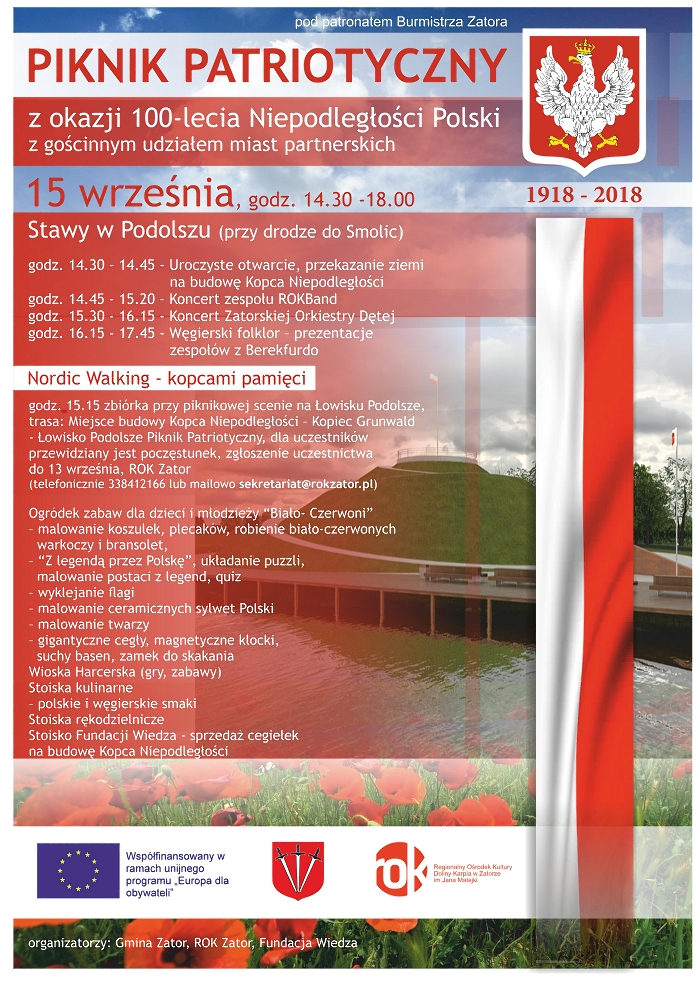 Przedstawiciele miast partnerskich wzięli także udział w imprezie plenerowej Europejski Piknik Patriotyczny. Piknik związany był z obchodami 100 lecia odzyskania przez Polskę Niepodległości, gdzie odbyły się występy miast partnerskich, prowadzono zajęcia dla dzieci (gry i zabawy, tworzenie logo spotkania miast partnerskich, malowanie flagi UE, Nordic Walking, wioska harcerska, stoiska kulinarne, polskie smaki, węgierska kuchnia, stoiska rękodzielnicze). Podczas pikniku przedstawiciele delegacji miast partnerskich przekazali ziemię pod budowę Kopca Niepodległości w Gminie Zator.