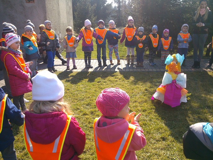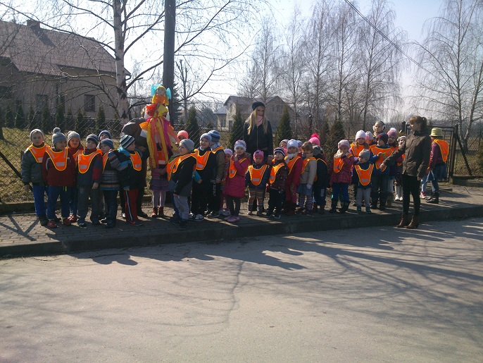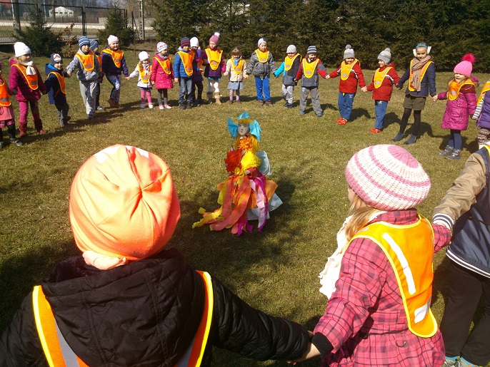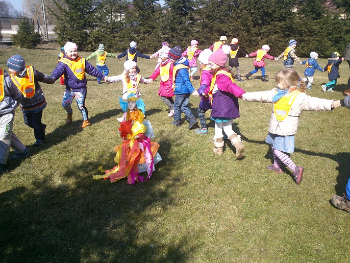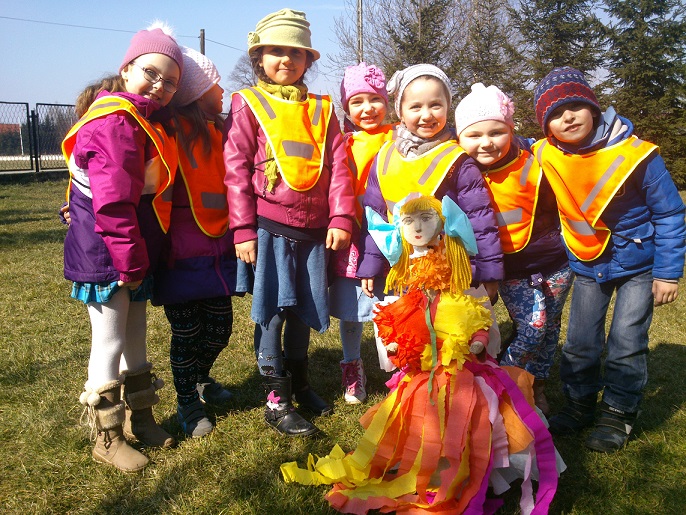 W dniu 20.03.2015r nasze Palczowickie przedszkolaki wraz z uczniami klas 1 i 2 oraz paniami nauczycielkami wybrały się na spacer, by jak co roku pożegnać zimę a przywitać ciepłą i słoneczną panią wiosnę. Wszyscy wspólnie przygotowaliśmy Marzannę- wielką zimową kukiełkę, a następnie kolorowym korowodem ruszyliśmy przez wioskę. Już w oddali można było zobaczyć nasze maszerujące pociechy ubrane w kamizelki odblaskowe, i trzymające w rękach głośno dzwoniące dzwoneczki, przeganiające zimę. „ Nie chcemy Cię zimo, wiosno przyjdź!”- wołały słodko rozzłoszczone maluchy. Marzannę wkopaliśmy w ogródku żeby zabrała ją w nocy odchodząca pani zima.