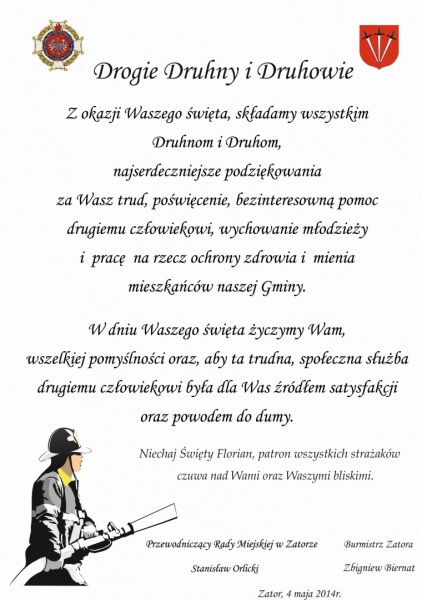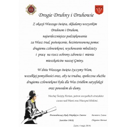Z okazji Waszego święta, składamy wszystkim Druhnom i Druhom,najserdeczniejsze podziękowania za Wasz trud, poświęcenie, bezinteresowną pomoc drugiemu człowiekowi, wychowanie młodzieży i pracę na rzecz ochrony zdrowia i mienia mieszkańców naszej Gminy.