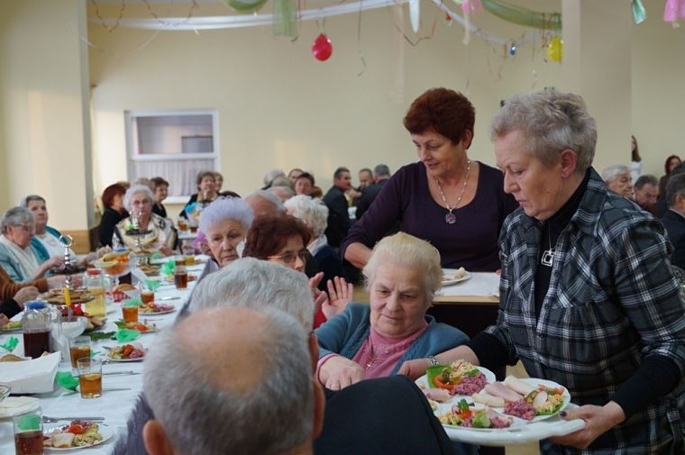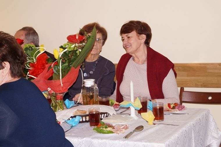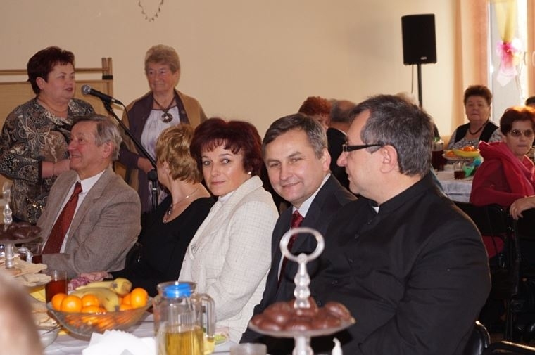 Ugościliśmy Seniorów sałatką warzywną z szynką, herbatą z cytryną na zimowe przeziębienia, klopsikami w sosie pieczarkowym z ryżem, kawą i ciastem karrmelowym upieczonym w nocy przez Zatorską piekarnię „WIZAN”, smacznym barszczykiem z uszkami . Na stołach były owoce i ciasteczka zasponsorowane przez Zakłady Przemysłu Cukierniczego „Skawa”SA w Wadowicach oraz piekarnię „WIZAN” w Zatorze , były też soki owocowe „Tymbark” zasponsorowane jak co roku przez Grupę „Maspex”. Wszystkie witaminy: jarzyny, owoce i nabiał zasponsorowali państwo Maria i Andrzej Sopiccy. Pan Edward Szymski tradycyjnie zapewnił odpowiednią ilość opłatków.