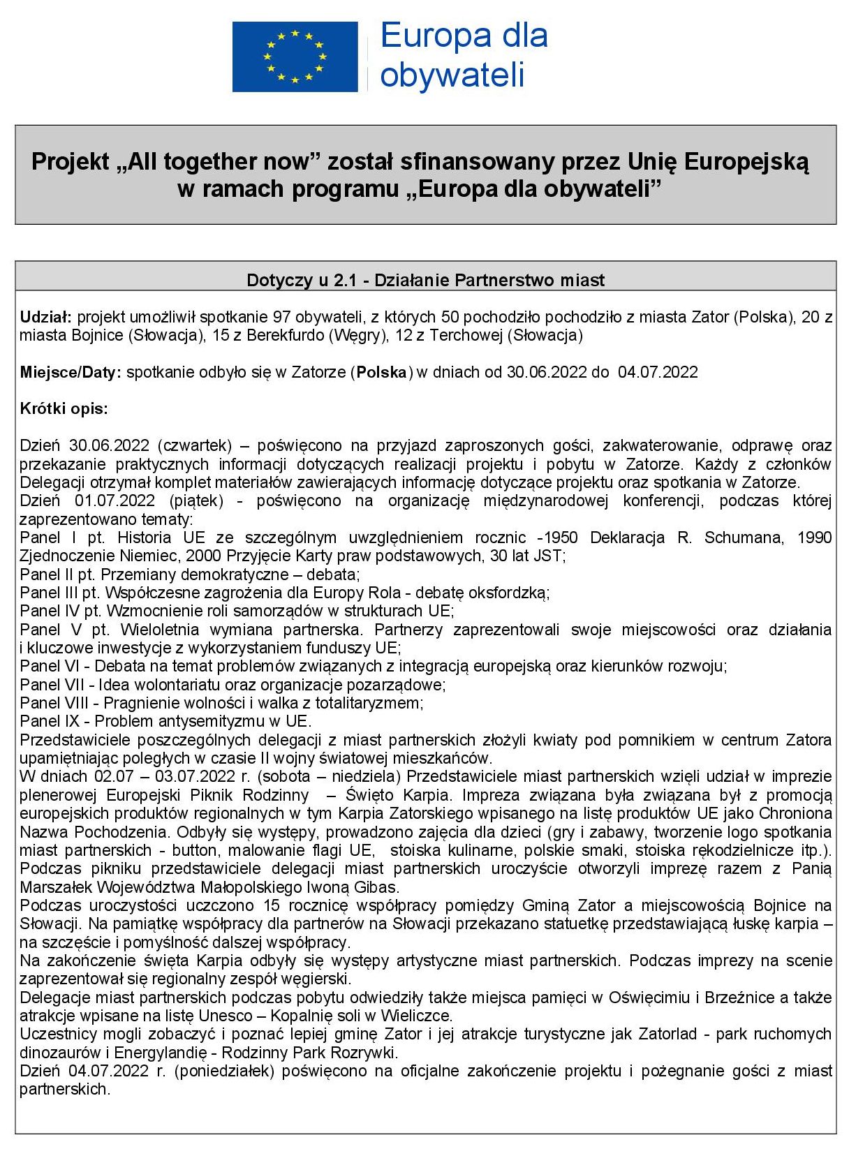 W dniach od 30.06.2022 do 04.07.2022 r. w ramach realizowanego przez Gminę Zator projektu pt. All together now“ współfinansowanego w ramach unijnego programu „Europa dla Obywateli” – Komponent 2. Demokratyczne zaangażowanie i uczestnictwo obywatelskie DZIAŁANIE 2.1 Partnerstwo miast do Zatora przyjechali przedstawiciele zaprzyjaźnionych miast partnerskich tj. węgierskiego Berekfurdo oraz Terchovej i Bojnic na Słowacji. Przyjmowaliśmy łącznie 47 uczestników w tym 20 osób z Bojnic, 15 z Berekfurdo i 12 osoby z Terchovej.