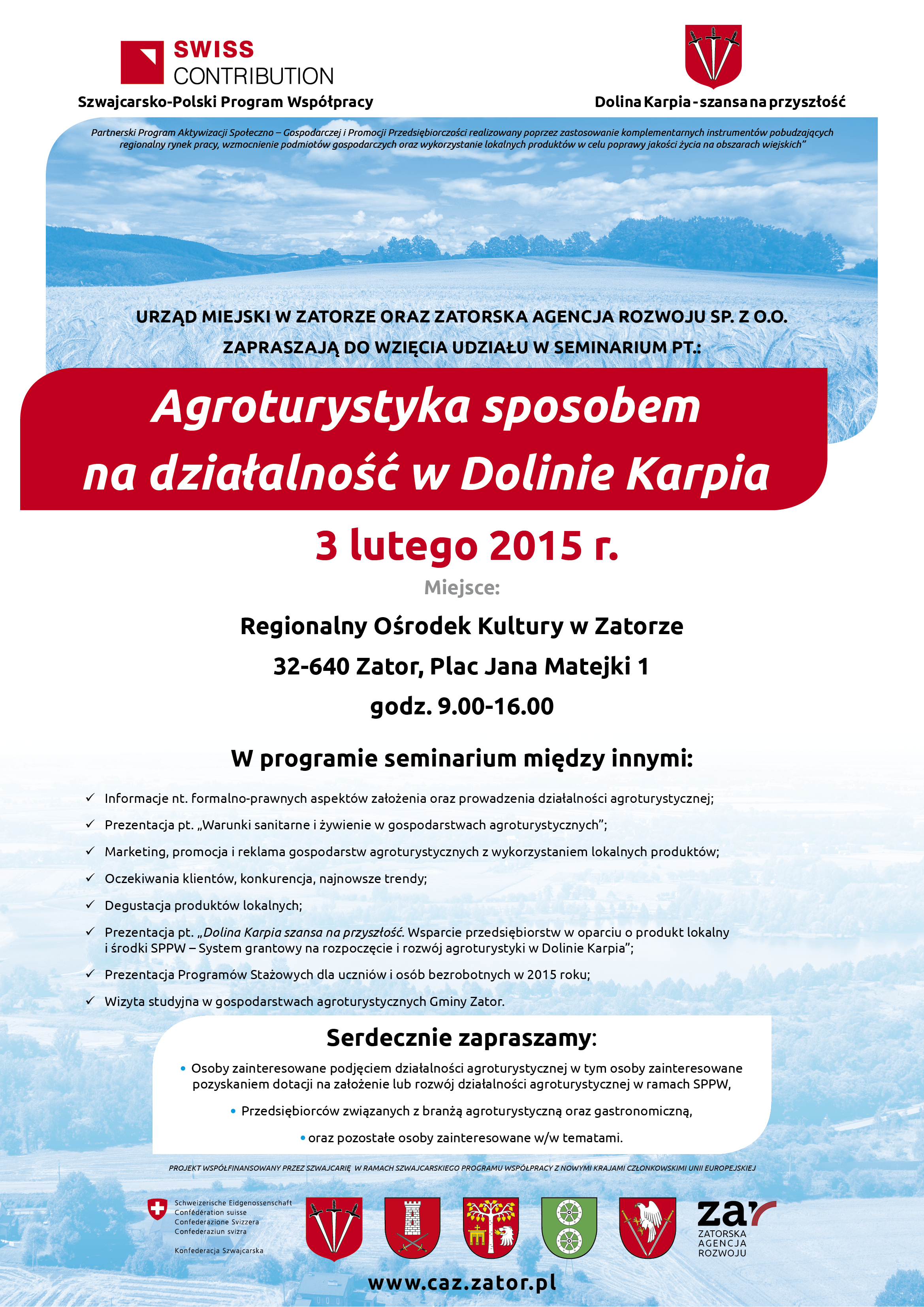 Zapraszamy na seminarium "Agroturystyka sposobem na działalność w Dolinie Karpia" w dniu 3 lutego 2015 roku w godzinach 9:00 - 16:00 w Regionalnym Osrodku Kultury w Zatorze, plac Jana Matejki 1, 32-640 Zator.