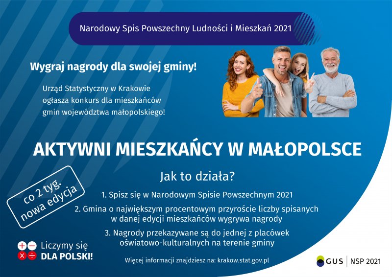 Głównym celem konkursu jest promocja NSP 2021 oraz zachęcenie mieszkańców województwa małopolskiego do aktywnego i licznego uczestnictwa w spisie.