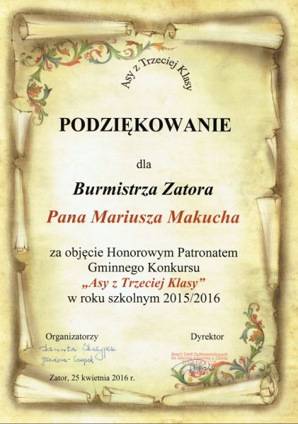 Honorowy Patronat nad konkursem objął Burmistrz Zatora Mariusz Makuch, który wręczy laureatom konkursu nagrody w dniu 4 maja 2016 r. w Urzędzie Miejskim.
