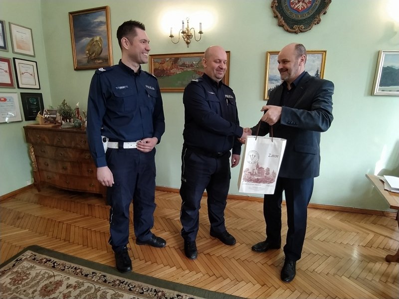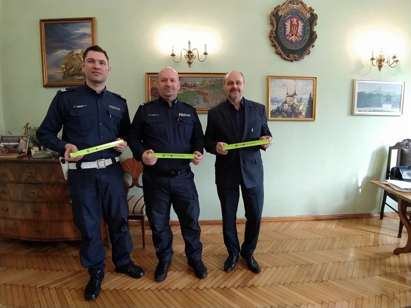 10 marca br. w Urzędzie w Miejskim w Zatorze Burmistrz Zatora przekazał na ręce Komendanta Komisariatu Policji podinsp. Dariusza Kuliga oraz sież. sztab. Mateusza Pająka z Wydziału Ruchu Drogowego Komendy Powiatowej Policji w Oświęcimiu opaski odblaskowe. Opaski zakupiono na potrzeby realizacji programu poprawy bezpieczeństwa i widoczności pieszych w Gminie Zator. Uprzejmie informujemy, że Wydział Ruchu Drogowego Komendy Powiatowej Policji w Oświęcimiu od marca br. będzie organizował w Gminie Zator spotkania z seniorami, dziećmi i młodzieżą podczas których rozdawane będą opaski. Do akcji włączył się samorząd Gminy Zator, który je ufundował. Mamy nadzieję, że polepszy to bezpieczeństwo na drodze, bo o tym że pieszy w ciemnym ubraniu i bez odblasków nie jest widoczny najlepiej wiedzą kierowcy. Bądź widoczny na drodze – dbamy o Twoje bezpieczeństwo.