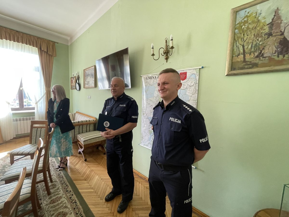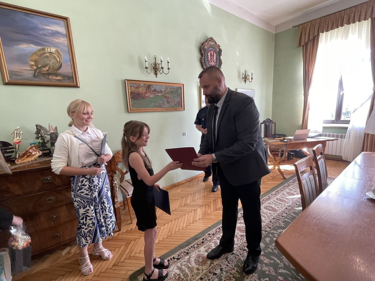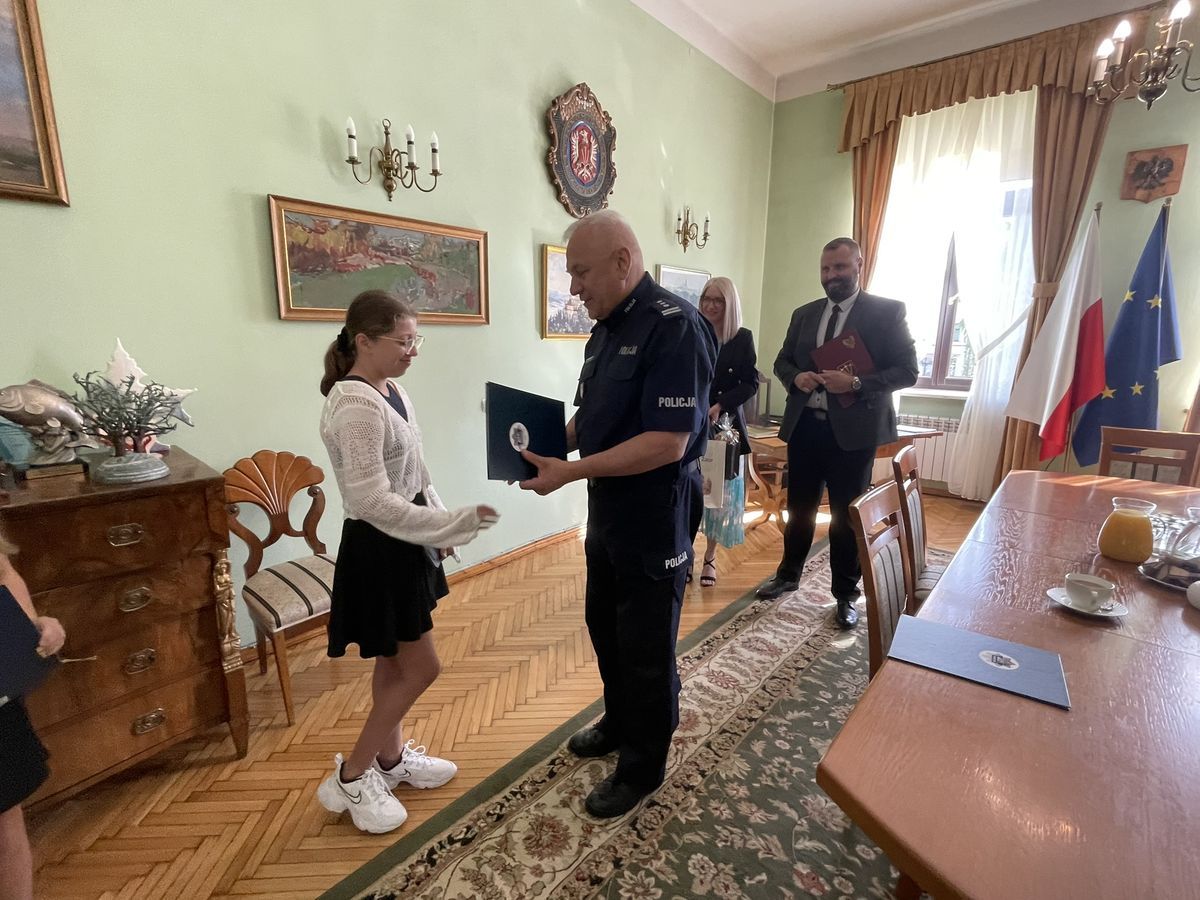 Nina, Julia oraz pani Barbara z rąk Burmistrza odebrały listy gratulacyjne oraz upominki, natomiast z rąk Komendanta otrzymały listy gratulacyjne i specjalne zaproszenie na indywidualne zwiedzanie oświęcimskiej komendy Policji.
