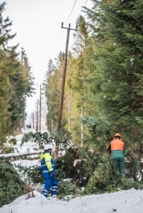 Wysokie drzewa, których gałęzie znajdują się blisko linii energetycznych bardzo często powodują awarie. Gałęzie, które zerwał wiatr lub te oblodzone i uginające się pod naporem śniegu łamią się, spadają na przewody i je niszczą. Często też łamią betonowe słupy. W takich sytuacjach pracownicy TAURON Dystrybucji muszą zadbać o to, aby prąd powrócił do wszystkich budynków.