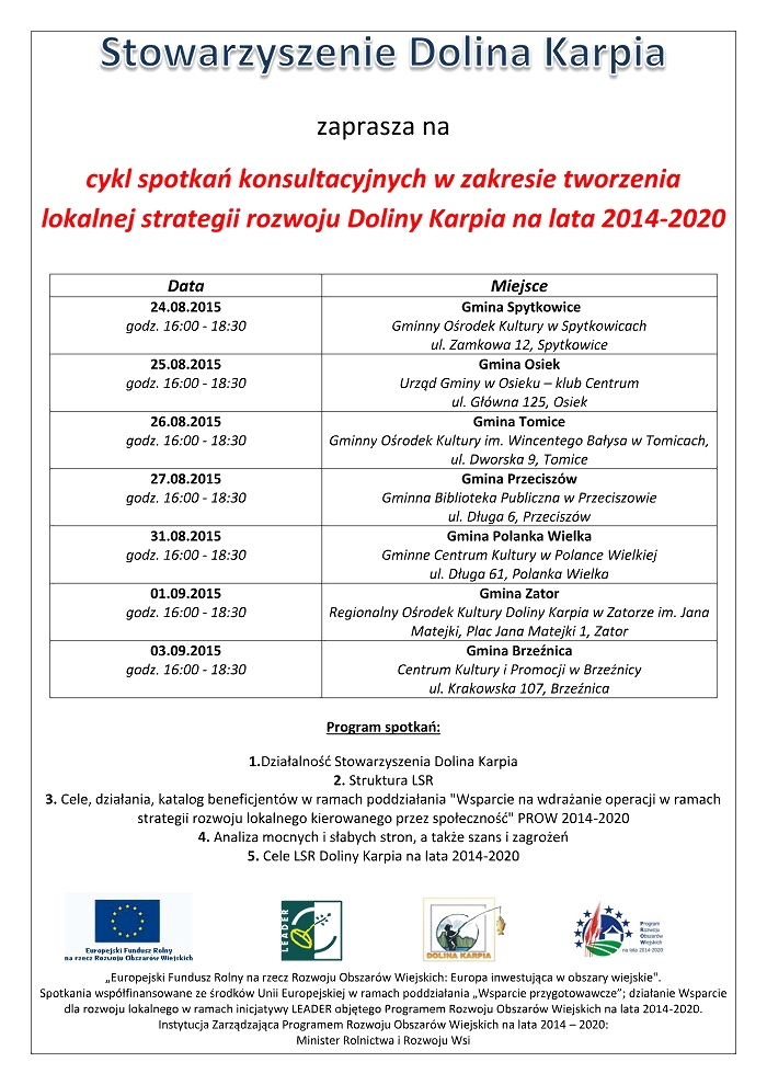 W związku z pracami prowadzonymi nad stworzeniem Lokalnej Strategii Rozwoju Doliny Karpia na lata 2014-2020, Zarząd Stowarzyszenia Dolina Karpia serdecznie zaprasza na cykl spotkań konsultacyjnych w zakresie tworzenia w/w LSR, które w dniach 24.08.2015 - 03.09.2015 roku odbędą się we wszystkich 7 gminach Doliny Karpia.