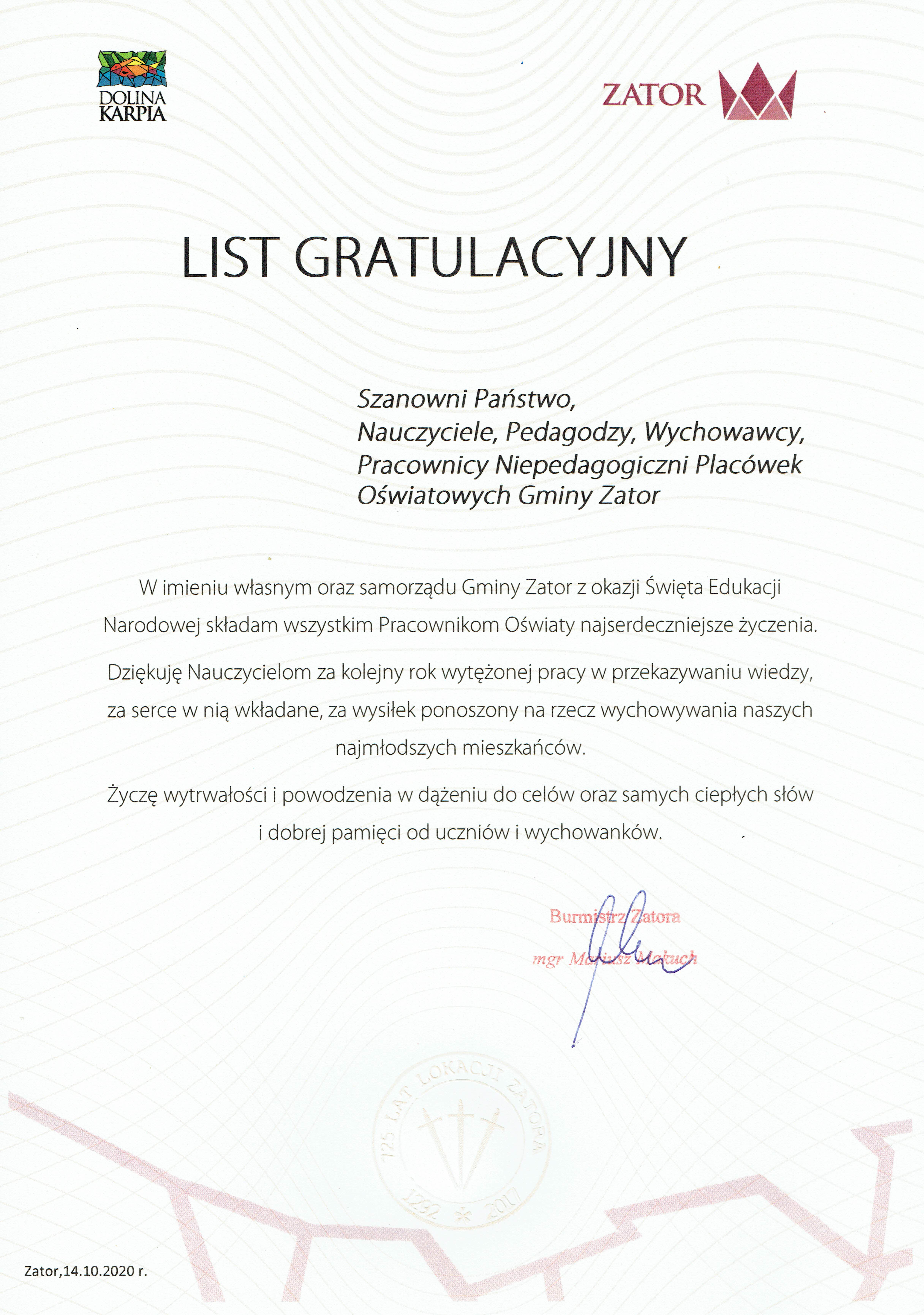 W imieniu własnym oraz samorządu Gminy Zator z okazji Święta Edukacji Narodowej składam wszystkim Pracownikom Oświaty najserdeczniejsze życzenia.