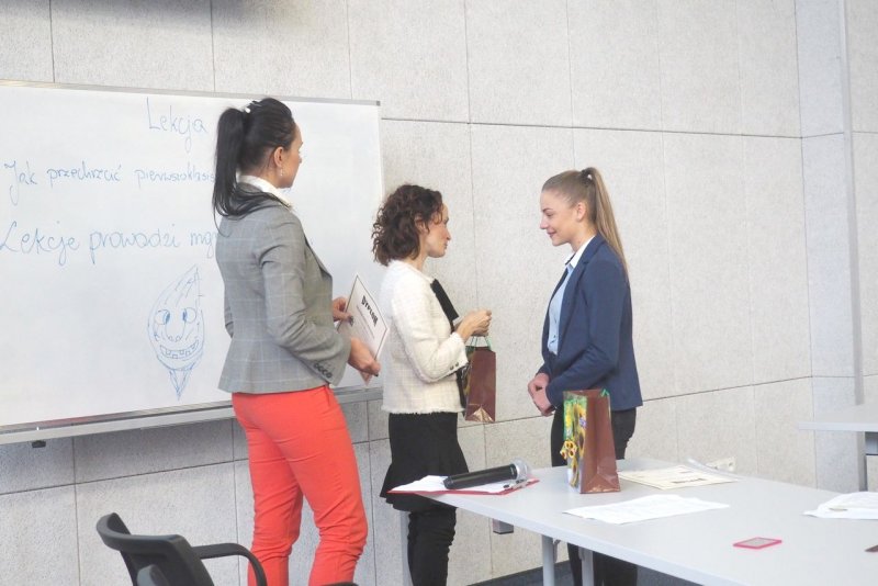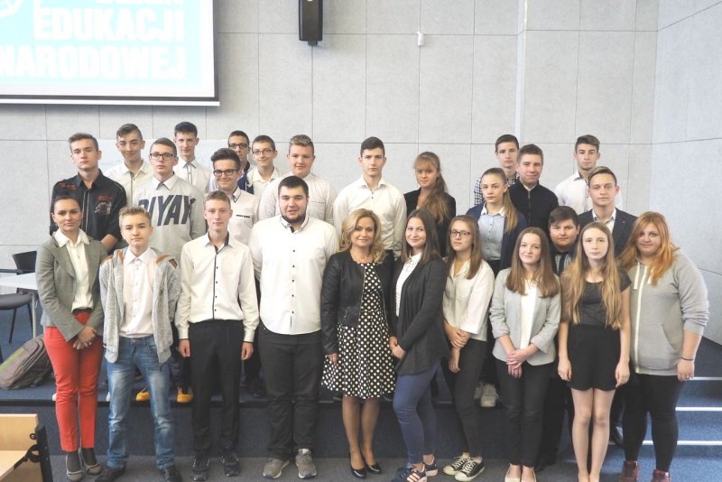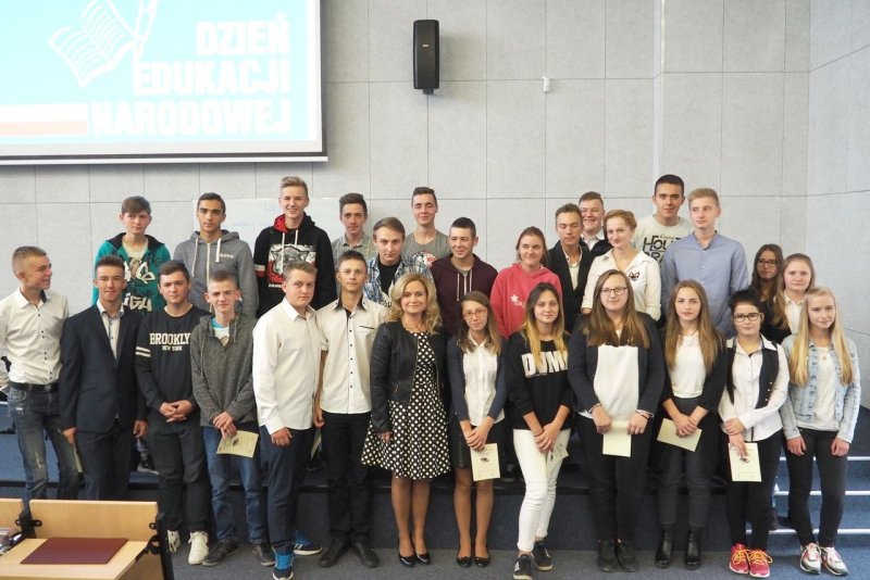 Nastroje powagi, wzruszenia, radości, dumy towarzyszyły tegorocznym obchodom Dnia Edukacji Narodowej. Kilka zdań o doniosłej roli edukacji w życiu człowieka, wypowiedzianych przez dzisiejszych konferansjerów rozpoczęło uroczystość. Poważną chwilę zadumy przerwało wkroczenie na scenę kolejnych bohaterów. W niezwykle żartobliwy sposób przedstawili najbardziej charakterystyczne fragmenty lekcji. Popis wokalny zachwycił słuchaczy, którzy odpowiedzieli gromkimi brawami. Poważny charakter uroczystości powrócił podczas przemowy pani dyrektor Marty Bies. Dziękujemy za to, że z nami jesteście. Zrobimy wszystko dla waszego rozwoju zawodowego i emocjonalnego. Będziemy z wami w czasie waszych sukcesów i porażek. Dziękujemy nauczycielom za trud włożony w opiekę i wychowanie uczniów. Wręczone nagrody nauczycielom były potwierdzeniem tych słów. Święto Edukacji Narodowej potocznie zwane Dniem Nauczyciela to święto nie tylko nauczycieli. To święto także wasze, nasi uczniowie. Ślubowanie uczniów klas pierwszych to kulminacyjny moment uroczystości. Z godnością wypowiadaliście słowo "ślubujemy". Wierzymy, że ta chwila była ważnym momentem w waszym życiu. Życzymy wam powodzenia. Niech porażki was nie załamują, a sukcesy będą nagrodą za waszą ciężka pracę. Spotkanie całej społeczności szkolnej było także okazją do wręczenia nagród za medalowe miejsca w konkursie wiedzy o krajach niemiecko i angielsko języcznych. Pierwsze miejsce zdobył Vitalij Prymak, drugie Dominika Dzidek, a trzecie Mateusz Krupa. Gratulujemy. Wręczenie dyplomów potwierdzających przynależność do naszej społeczności szkolnej oraz życzenia dla nauczycieli zakończyło akademię