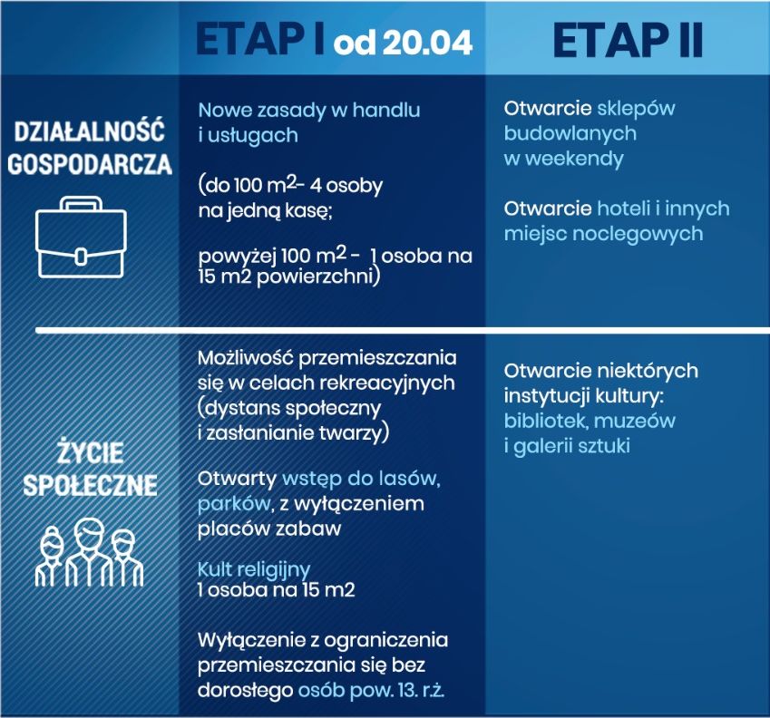 Od 20 kwietnia br. zmienią się niektóre zasady bezpieczeństwa. Zakupy w sklepie zrobi w jednym czasie więcej osób, do lasu i parku wejdziemy w celach rekreacyjnych, a młodzież powyżej 13. roku życia będzie mogła poruszać się bez opieki osoby dorosłej. Proces ten będzie podzielony na etapy – tak, aby zachować maksimum bezpieczeństwa obywateli.
