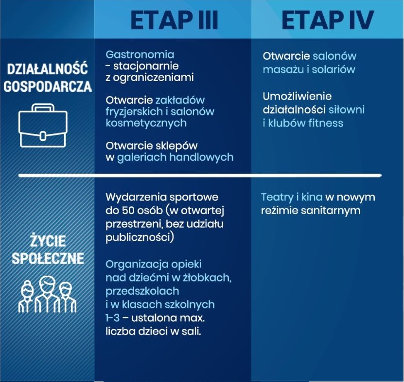 Kolejne etapy powrotu do normalności będą wprowadzane stopniowo, gdy przyrost zachorowań w naszym kraju będzie niski. Nie oznacza to jednak, że powinniśmy rezygnować z dyscypliny społecznej i przestrzegania obowiązujących ograniczeń. Pamiętajmy, że to od nas zależy, jak szybko będą wprowadzane kolejne etapy powrotu do nowej rzeczywistości!