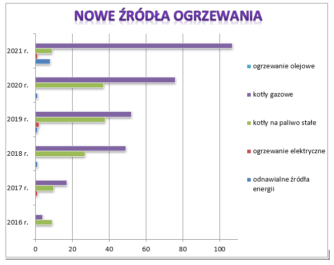 Gmina Zator w dalszym ciągu przeznacza środki pieniężne na dofinansowanie wymiany starych źródeł ciepła zasilanych paliwem stałym. Zamieszczona poniżej tabela pokazuje stan na koniec 2021 roku (zestawienie nie uwzględnia Programu „Czyste Powietrze”). W tym czasie udzielono dotacji do 450 inwestycji polegających na modernizacji przestarzałego systemu ogrzewania (w tym dofinansowanie 19 inwestycji z RPO WM oraz 5 z dotacją Powiatu Oświęcimskiego). Poniższy wykres obrazuje skalę najczęściej wybieranych źródeł ogrzewania.