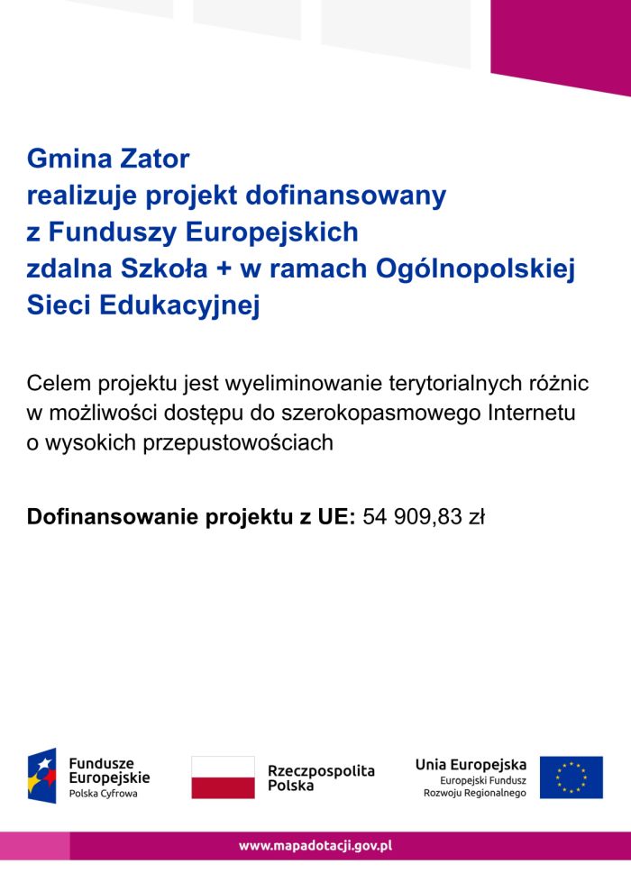 Projekt realizowany w ramach Programu Operacyjnego Polska Cyfrowa na lata 2014-2020 Osi Priorytetowej nr I „Powszechny dostęp do szybkiego Internetu” działania 1.1: „Wyeliminowanie terytorialnych różnic w możliwości dostępu do szerokopasmowego internetu o wysokich przepustowościach” dotycząca realizacji projektu grantowego pn. zdalna Szkoła+ w ramach Ogólnopolskiej Sieci Edukacyjnej.