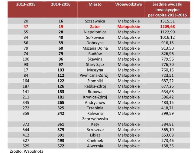 Dla większości samorządów 2016 rok w porównaniu z wcześniejszymi latami był rokiem spadku inwestycji. Wówczas zakończyło się rozliczanie funduszy unijnych z poprzedniej perspektywy finansowej, a prace nad nowymi konkursami dopiero ruszały. Pomimo spadku poziomu inwestycji w skali kraju, Zator nie tylko uzyskał wysokie miejsce w rankingu, ale równocześnie awansował z 47 pozycji na 19. Średnie wydatki inwestycyjne w latach 2014 – 2016 w naszej gminie wyniosły 1209,68 zł na mieszkańca. Na tle innych miast w Małopolsce Zator zajął II miejsce. W skali naszego województwa wyprzedziła nas tylko Szczawnica. Uzyskanie takiej pozycji Gminy Zator świadczy o zaangażowaniu władz lokalnych w działania mające na celu podniesienie atrakcyjności gospodarczej regionu.