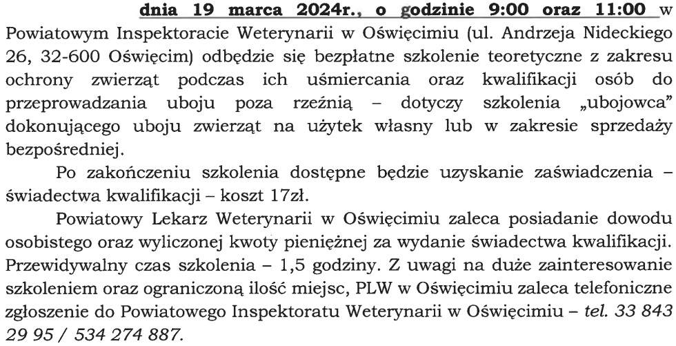 Poniżej zamieszczamy fragment pisma otrzymanego od Powiatowego Lekarza Weterynarii w Oświęcimiu, dotyczący bezpłatnego szkolenia: