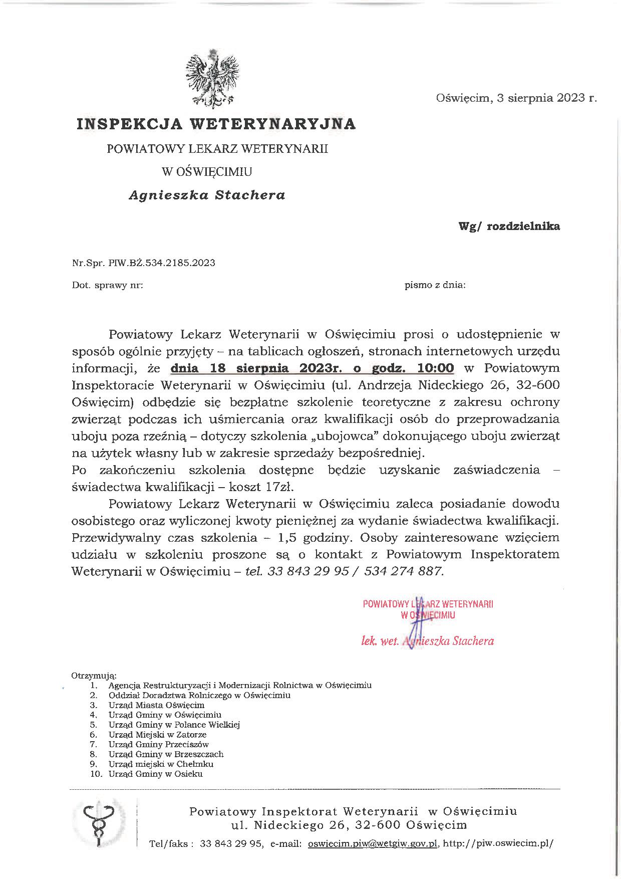 Informacja Powiatowego Lekarza Weterynarii w Oświęcimiu 2023-08-04