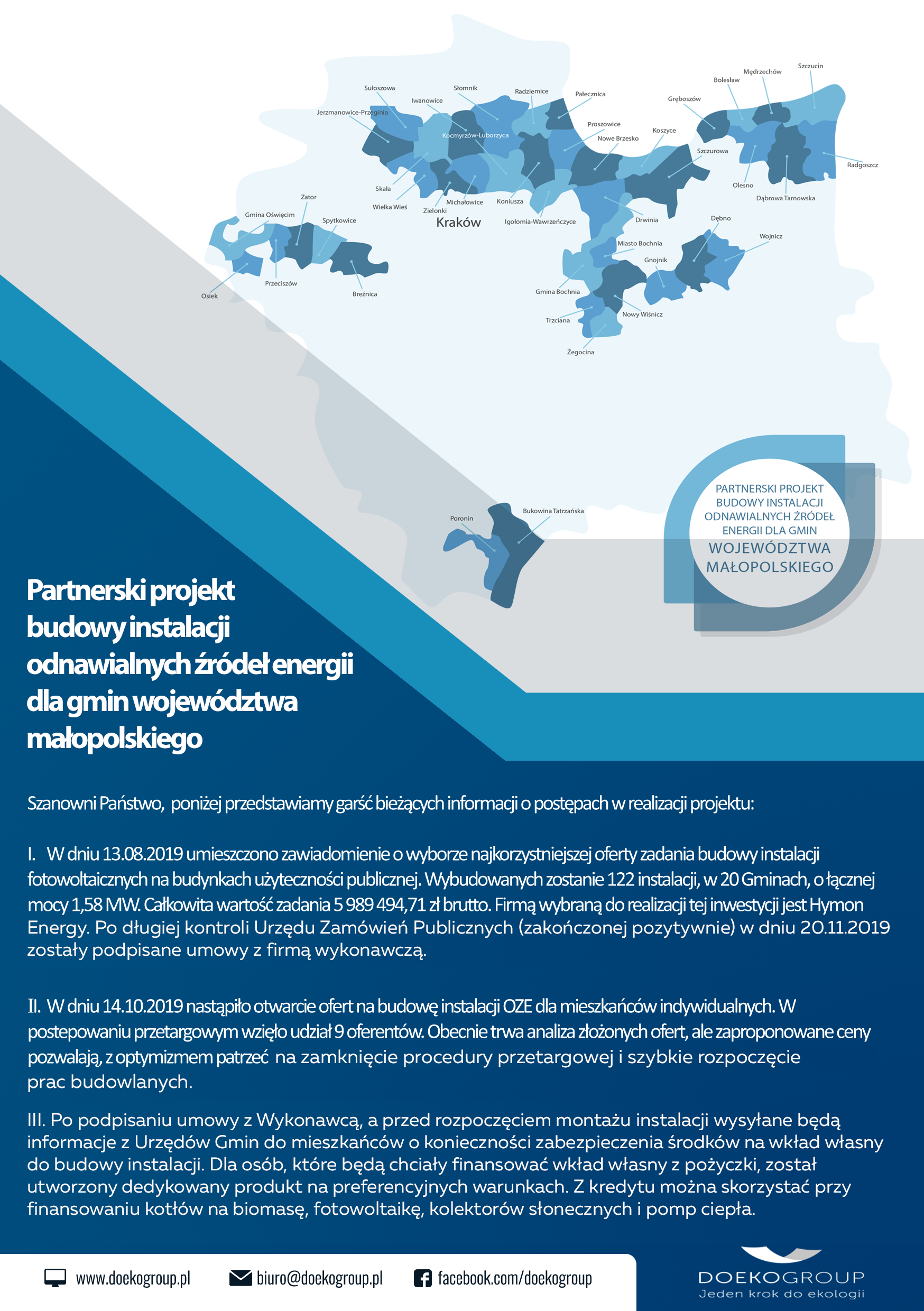 Projekt pn. „Partnerski Projekt Budowy Instalacji Odnawialnych Źródeł Energii dla Gmin Województwa Małopolskiego” jest współfinansowany przez Unię Europejską ze środków Europejskiego Funduszu Rozwoju Regionalnego w ramach Regionalnego Programu Operacyjnego Województwa Małopolskiego na lata 2014-2020