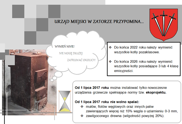 Urząd Miejski w Zatorze przypomina o obowiązującej uchwale antysmogowej przyjętej przez Sejmik Województwa Małopolskiego, dotyczącej ograniczeń i zakazów w zakresie eksploatacji instalacji, w których następuje spalanie paliw.