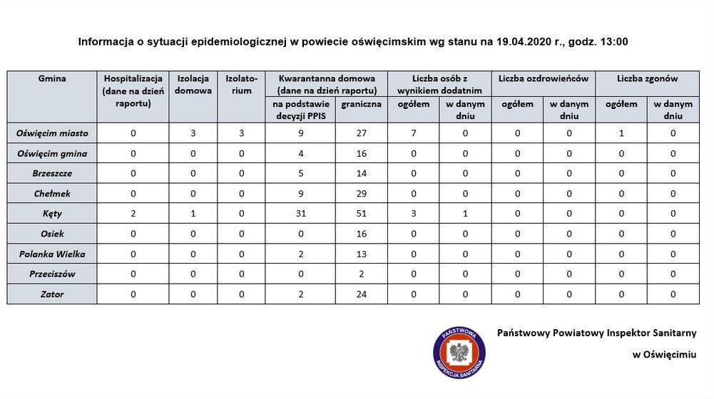Uprzejmie informujemy, że na terenie gminy Zator nie ma osób z pozytywnym wynikiem na obecność koronawirusa. Domową kwarantanną objętych zostało 24 osoby, a 2 osoby kwarantanną Państwowego Powiatowego Inspektora Sanitarnego w Oświęcimiu. Informacje opracowano wg stanu na dzień 19.04.2020r. na godz. 13:00. Szczegółowe informacje na temat sytuacji epidemiologicznej w powiecie oświęcimskim dostępne poniżej.