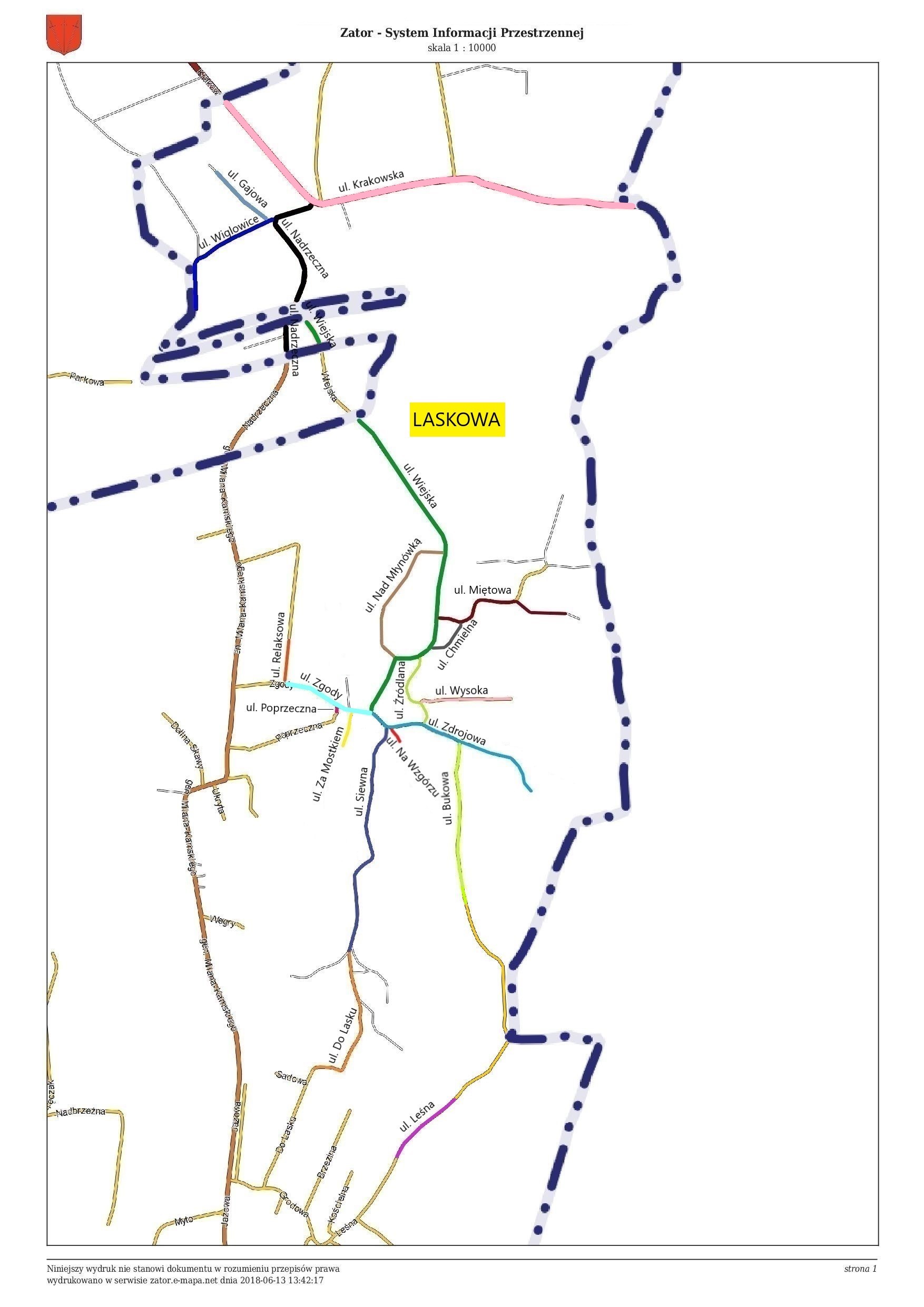 Jest to już dziewiąta wioska, dla której wprowadzono nową numerację porządkową. Uchwałą Nr XLIV/381/18 Rady Miejskiej w Zatorze z dnia 27 marca 2018 r., opublikowaną w Dzienniku Urzędowym Województwa Małopolskiego w dniu 25 kwietnia 2018 roku oraz Uchwałą Nr LII/425/18 Rady Miejskiej w Zatorze z dnia 25 września 2018 r., opublikowaną w Dzienniku Urzędowym Województwa Małopolskiego w dniu 10 października 2018 roku, wprowadzono nazwy dwudziestu nowych ulic w Laskowej: