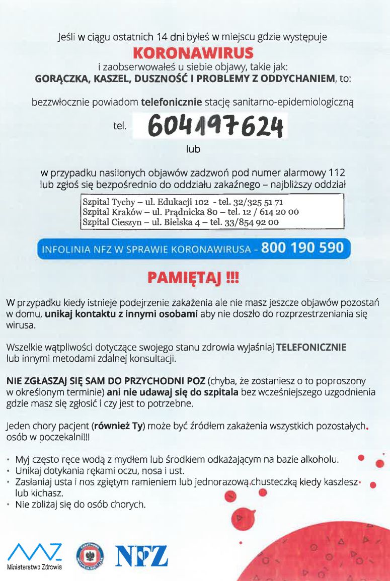 Pod numerem bezpłatnej i całodobowej Telefonicznej Informacji Pacjenta uzyskasz informacje o postępowaniu w sytuacji podejrzenia zakażenia koronawirusem.