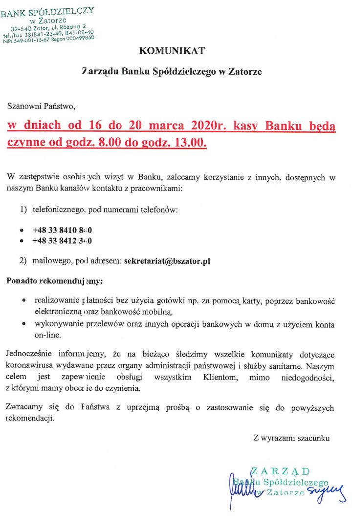 Komunikat Zarządu Banku Spółdzielczego w Zatorze 2020-03-15