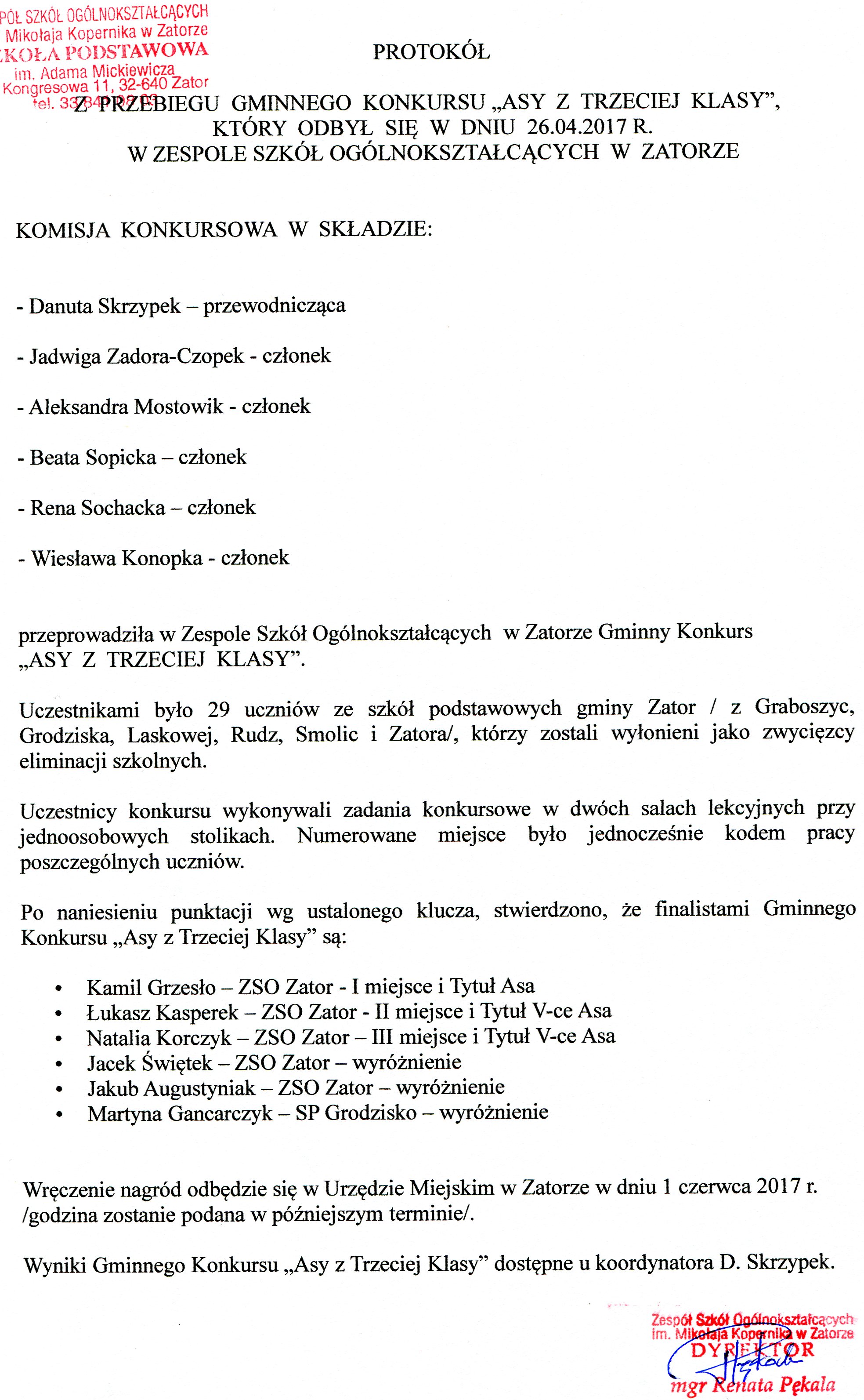 Szkoła Podstawowa im. Adama Mickiewicza w Zatorze po raz kolejny miła zaszczyt organizować Konkurs "ASY Z III KLASY" skierowany do uczniów trzecich klas SP. Zaproszenie do Konkursu wystosowano do wszystkich szkół podstawowych zlokalizowanych na terenie Gminy Zator. I tym razem szkoły licznie odpowiedziały na zaproszenie. Wytypowano delegatów, którzy dumnie reprezentowali kolegów i koleżanki ze swoich szkół.