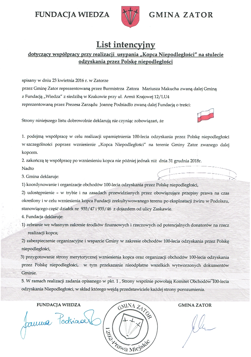 Burmistrz Zatora – Mariusz Makuch podpisał list intencyjny z Fundacją „Wiedza” z Krakowa o współpracy przy budowie „Kopca Niepodległości” w Podolszu, który powstanie dla upamiętnienia 100-lecia odzyskania naszej niepodległości w 1918 r. Inicjatywa ta zrodziła się w Fundacji, która uznała właśnie naszą gminą, jako najlepsze miejsce dla tego monumentalnego obiektu architektonicznego.