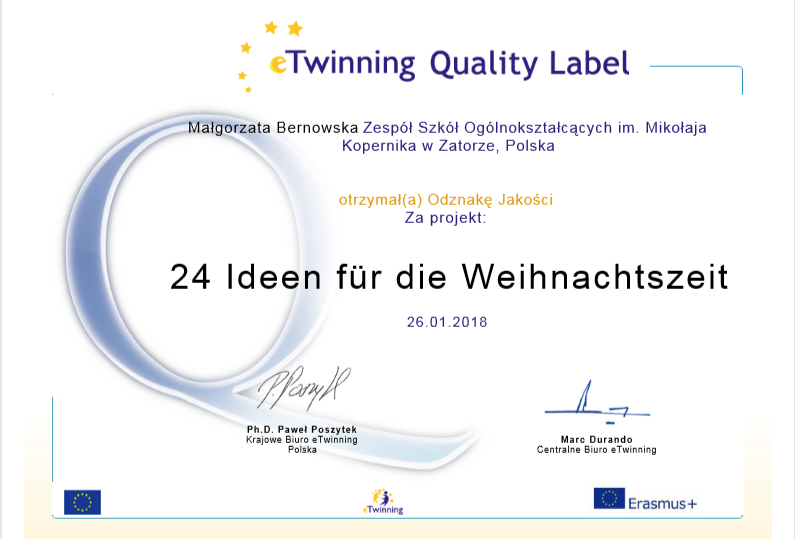 26 stycznia nasza szkoła otrzymała kolejną Krajową Odznakę Jakości za projekt eTwinning z języka niemieckiego „24 Ideen für die Weihnachtszeit" – „24 pomysły przed Świętami Bożego Narodzenia”. W projekcie wzięło udział 82 uczniów z 8 krajów, w tym 3 szkoły z Polski oraz z Węgier, Włoch, Francji, Chorwacji i Turcji.