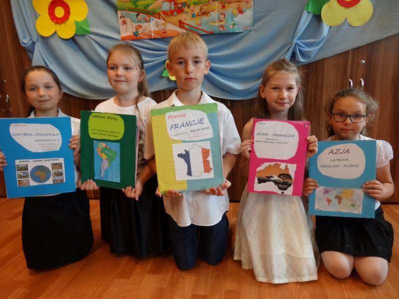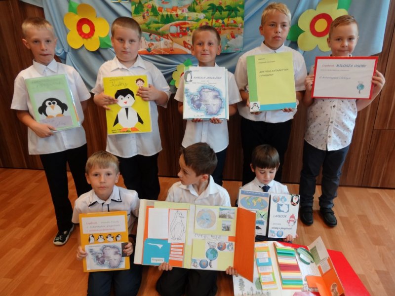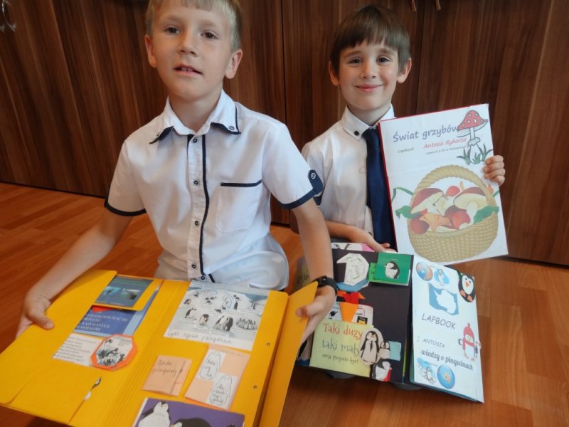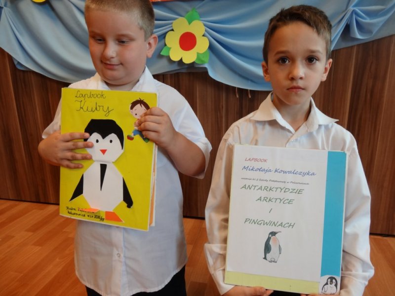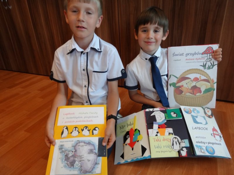 Książka na kolanach, czyli lapbook zawitał do Zespołu Szkolno – Przedszkolnego w Palczowicach. Zaczęło się od „Zaczarowanej zagrody” A. Cz. Centkiewiczów ulubionej lektury drugoklasistów. Uczniowie zainspirowani pomysłem Pani dyr Anny Górszczyk na zajęciach pozalekcyjnych zdobywali informacje o Antarktydzie, pingwinach i polskich polarnikach. Następnie szukali ciekawostek, wycinali, rysowali, wklejali wszystkie przygotowane materiały. Powstały pierwsze lapbooki. Uczniowie 3 klasy pracowali w tym czasie nad lapbookami o różnych kontynentach. Takie własnoręcznie przygotowane książeczki budziły zainteresowanie kolegów i koleżanek. Dzieciaki chętnie je oglądały i czytały. Szukały pomysłów i inspiracji do nowych wyzwań. Antoś już pracuje nad swoim nowym lapbookiem o grzybach. To doskonała metoda na rozbudzanie zainteresowań i kreatywności nawet u najmłodszych. Natalia i Amelka od nowego roku idą do pierwszej klasy, a ich książeczki o kotkach są naprawdę urocze. Każdy lapbook jest inny i niepowtarzalny, tak jak nasze dzieci. Dziś na zakończeniu roku szkolnego mogli je podziwiać także rodzice. Teraz chcemy pokazać je wszystkim.