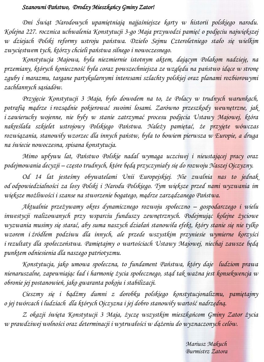 List Burmistrza Zatora do Mieszkańców Gminy Zator z okazji obchodów Święta 3 Maja 2018-05-03