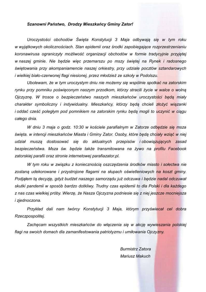 List Burmistrza Zatora z okazji obchodów Święta Konstytucji 3 Maja