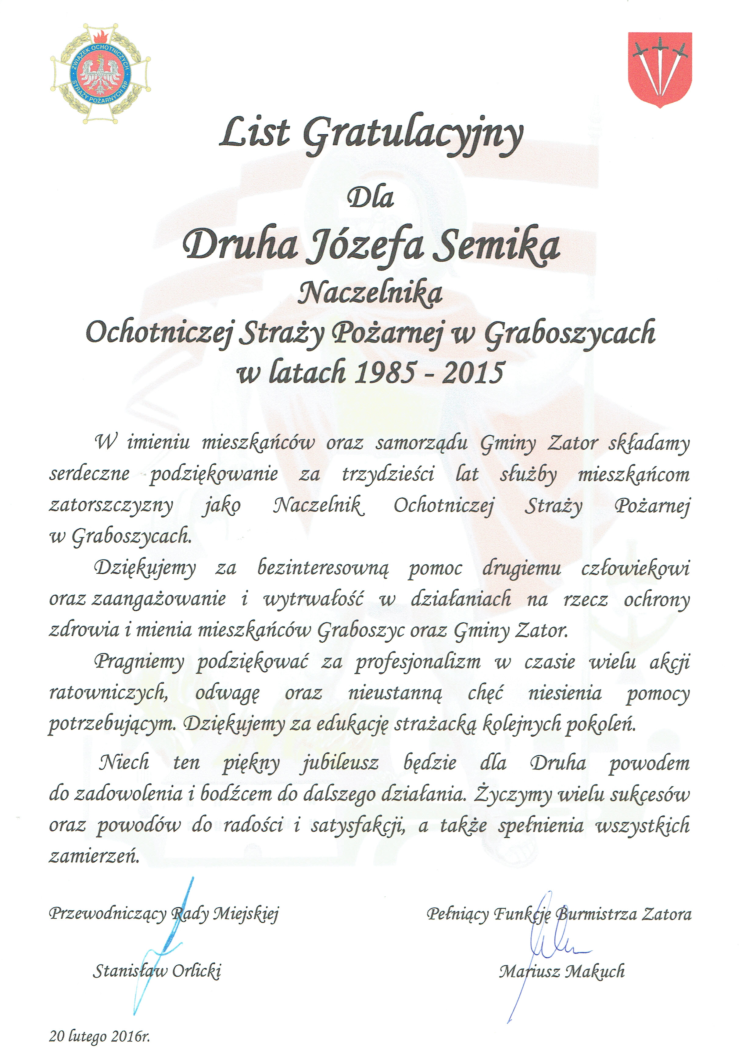 List Gratulacyjny dla Druha Józefa Semika 2016-02-24