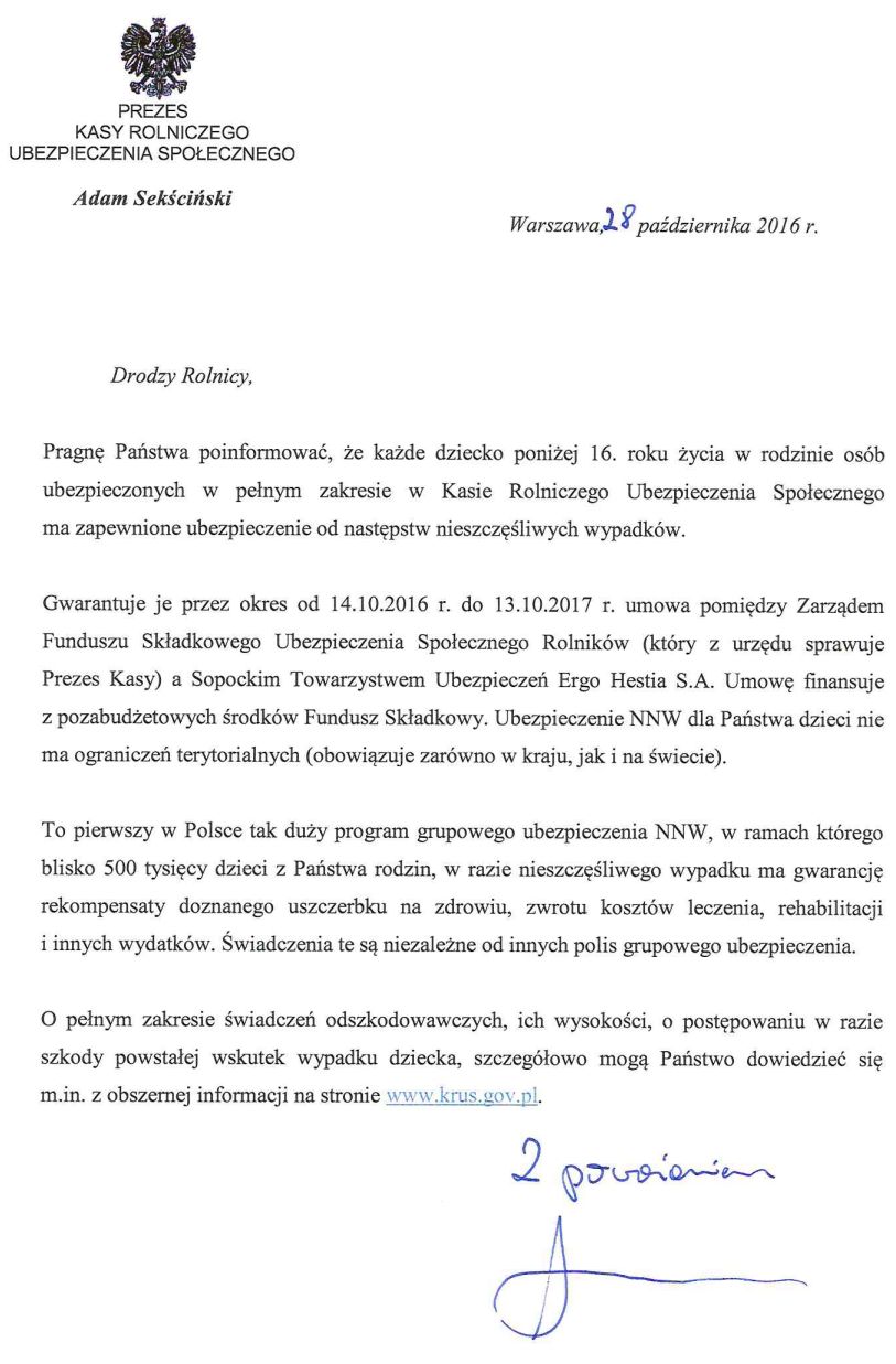 List Prezesa Kasy Rolniczego ubezpieczenia Społecznego skierowany do rolników 2016-11-21