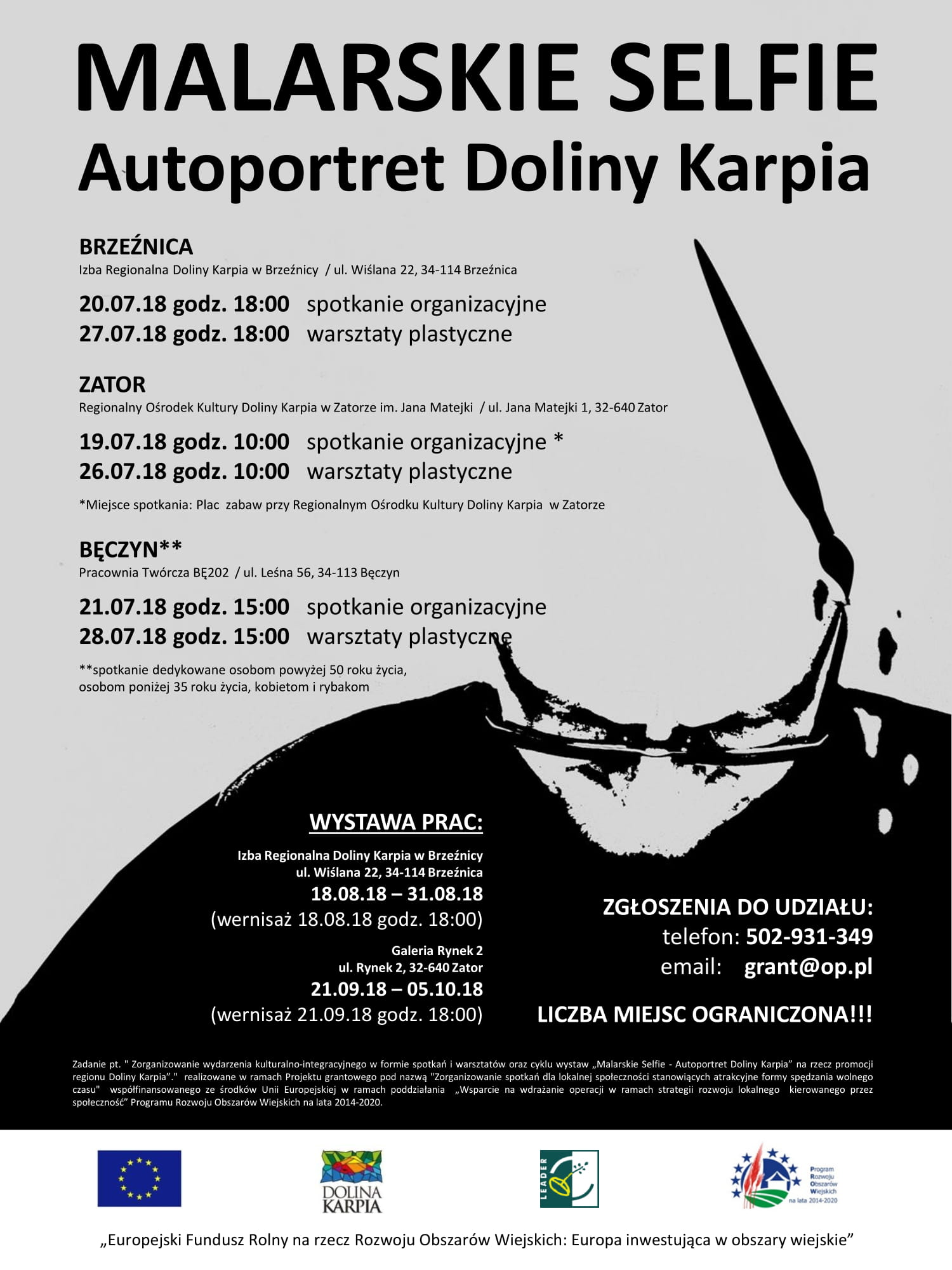Zadanie pt. „Zorganizowanie wydarzenia kulturalno-integracyjnego w formie spotkań i warsztatów oraz cyklu wystaw „Malarskie Selfie - Autoportret Doliny Karpia” na rzecz promocji regionu Doliny Karpia”." realizowane w ramach Projektu grantowego pod nazwą "Zorganizowanie spotkań dla lokalnej społeczności stanowiących atrakcyjne formy spędzania wolnego czasu" współfinansowanego ze środków Unii Europejskiej w ramach poddziałania „Wsparcie na wdrażanie operacji w ramach strategii rozwoju lokalnego kierowanego przez społeczność” Programu Rozwoju Obszarów Wiejskich na lata 2014-2020.