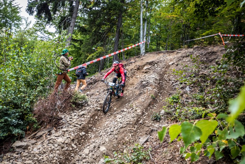 To pierwszy medal dla naszego klubu, w tej odmianie kolarstwa górskiego. Enduro, to wysoce extremalny sport, polegający na pokonywaniu bardzo trudnych tras, podzielonych na odcinki specjalne. Michał, znany jest z tego, iż bardzo dobrze „dogaduje” się z każdym ze swych rowerów i to w każdym możliym terenie. Dlatego padł pomysł, na próbie sił w Mistrzostwach Polski Enduro. Organizacja tego przedsięwzięcia nie była łatwa. Nie mając specjalistycznego sprzętu i większego doświadczenia, przez wielu, byliśmy skazani na porażkę. Jednak.. Właśnie – czego się nie robi dla realizacji marzeń. Zaufał nam producent rowerów, firma ROCK MACHINE. Na prośbę o udostępnienie roweru, właściwie w tym samym dniu dostaliśmy zaproszenie do fabryki, po najwyższej klasy sprzęt. Wizyta w Czechach, krótkie spotkanie z działem marketingu i mamy rower w bagażniku. Lekkie modyfikacje ogumienia, mleko TREZADO w miejsce dętek i Michał zaczyna uczyć się wykorzystywać możliwości, jakie daje ten rower.