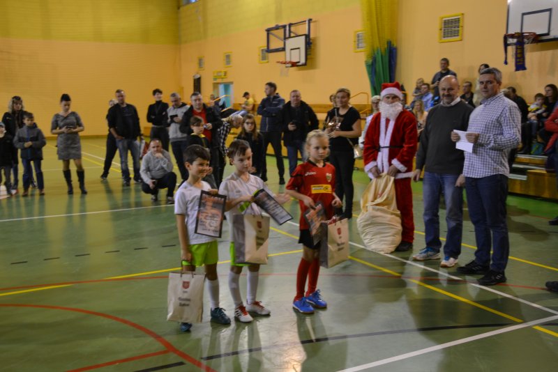 Na początek dnia rywalizacje rozpoczęły najmłodsi adepci sztuki piłkarskiej ,a więc Skrzaty /rocznik 2012 i młodsi/. Dla wielu młodych zawodników były to pierwsze oficjalne zawody sportowe co bardzo ich motywowało. Piłkarze dopingowani przez pełną widownię rozgrywali swoje mecze wkładając w każde kopniecie piłki i każde starcie z przeciwnikiem całe swoje serce. W turnieju udział wzięło sześć drużyn LKS Zatorzanka, Górnik Brzeszcze, LKS Strumień Polanka Wielka, Akademia Piłkarska Unia Oświęcim i UKS Kozy. Wyników w tej grupie nie sumowano. Na zakończenie zawodów na zatorską halę przybył” Święty Mikołaj „,który rozdawał wszystkim uczestnikom medale i prezenty. W tym czasie cała Zatorska hala pękała w szwach.