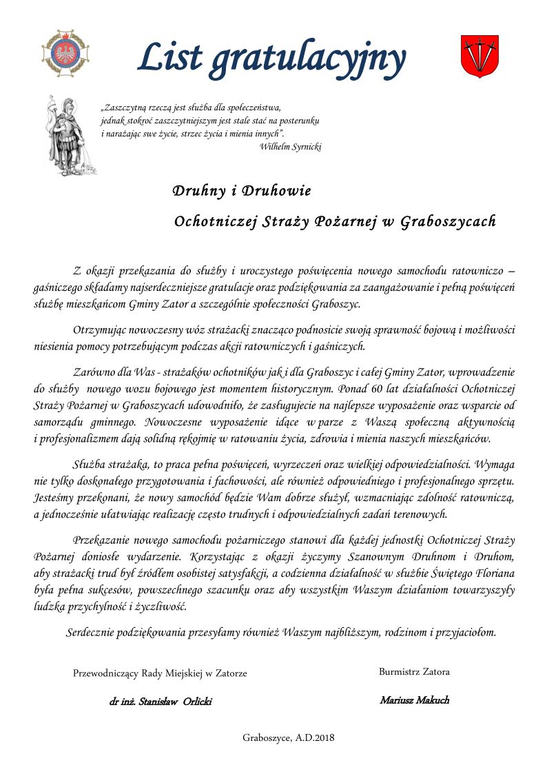 Nowy pojazd ratowniczo-gaśniczy zakupiony został z budżetu gminy dla Ochotniczej Straży Pożarnej w Graboszycach. Burmistrz Zatora – Mariusz Makuch oraz Przewodniczący Rady Miejskiej w Zatorze dr Stanisław Orlicki w trakcie urpoczystego przekazania w remizie OSP Graboszyce podkreślali, iz nowo zakupiony wóz strażacki znaczaco przyczyni sie do poprawy bezpieczeństwa Gminy Zator i Powiatu Oswięcimskiego.